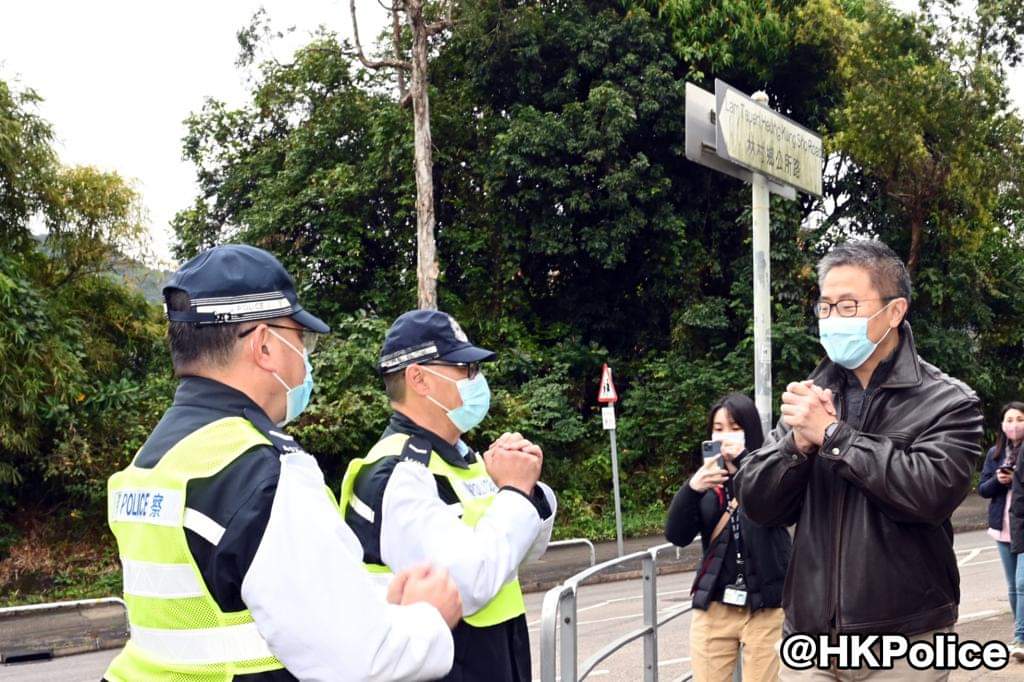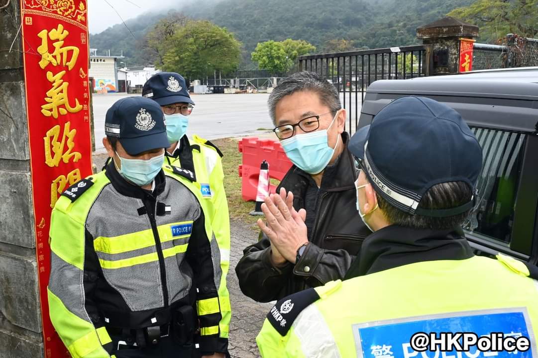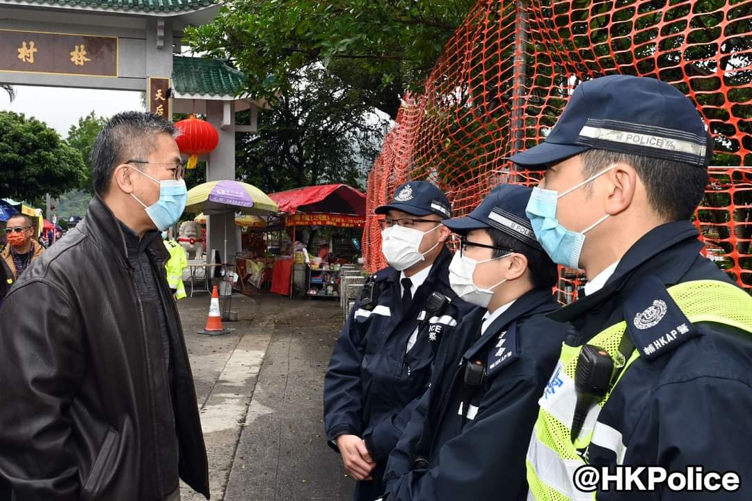 蕭澤頤到沙田車公廟和大埔林村探訪當值警務人員。(香港警察facebook圖片)