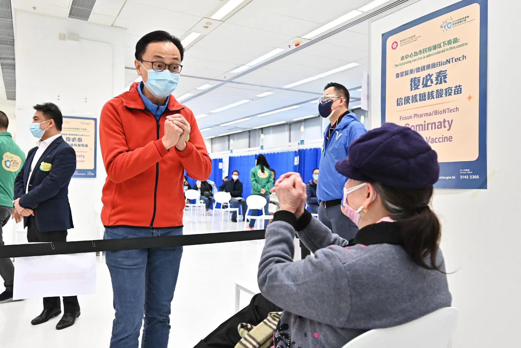 聶德權(左)與一名剛接種疫苗的市民交談。
