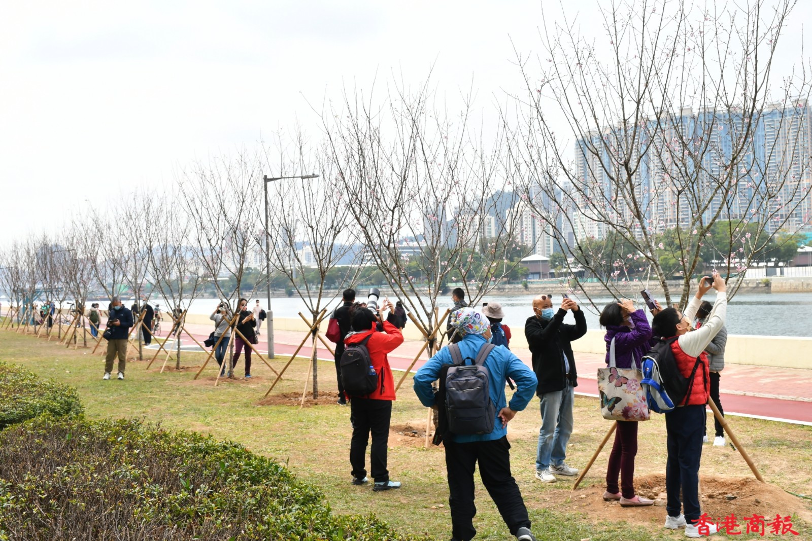 政府在公園內栽種了10棵富士櫻,花色偏向粉紅、淡紅,有五枚單瓣,呈覆瓦狀,粉嫩狀態仿似少女舉手投足般。10棵櫻花樹排列整齊,分開擺放,雖然沒能形成花海效果,不過仍然吸引不少市民及攝影愛好者到來欣賞,成為城門河畔新景點。(馮瀚文 攝)