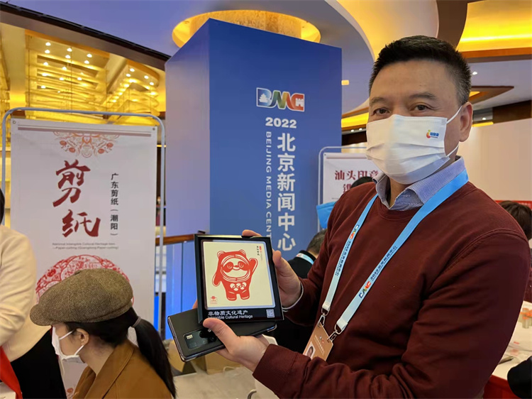 汕頭市文化館館長王建兵向記者介紹潮陽剪紙《冰墩墩》