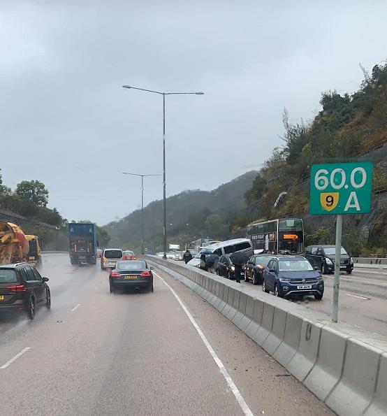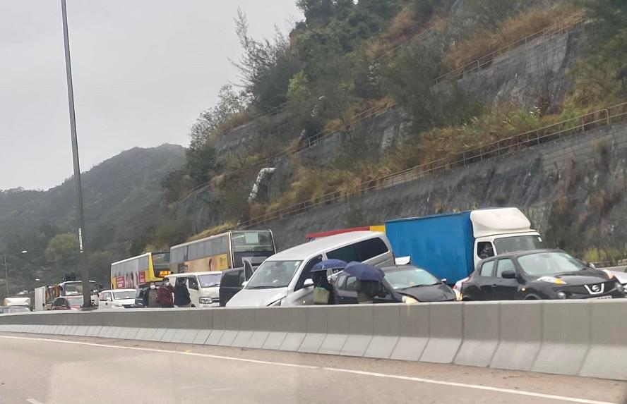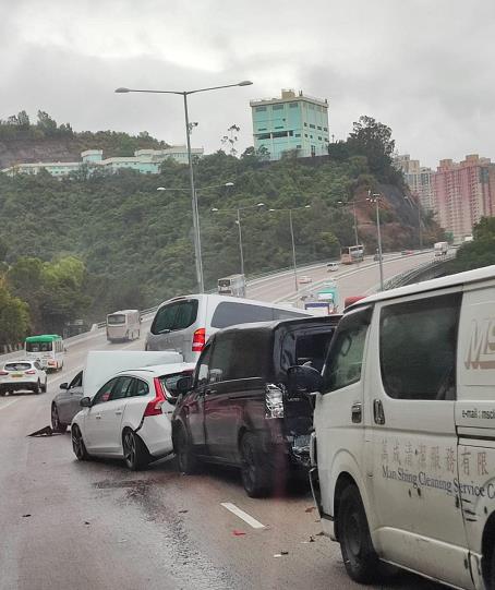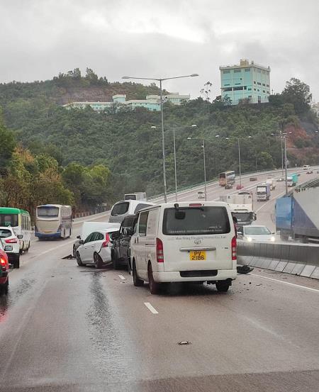 今日(21日)上午8時許,屯門公路往九龍方向發生8車連環相撞交通意外,近豪景花園對開快線8車首尾相撞,其中一輛客貨車與前車相撞後,擱在另一輛車上,險衝入對面行車線,途經駕駛人士見狀報警求助。