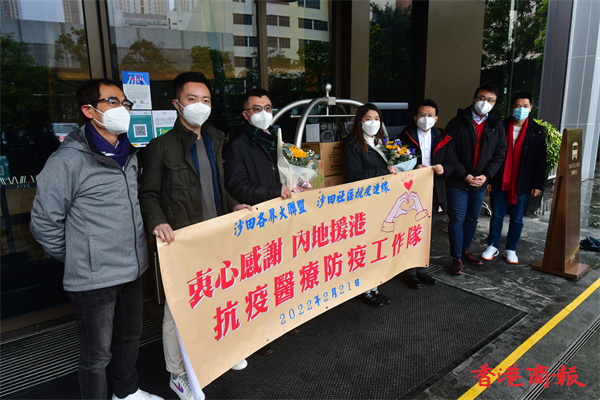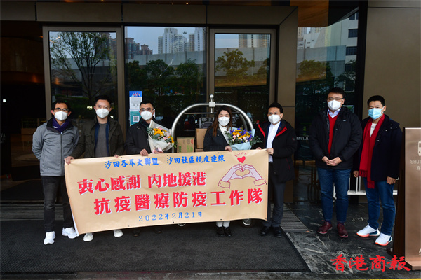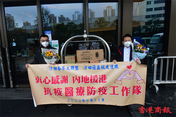 本港第五波疫情大爆發,確診個案急速上升。在中央統籌和號召下,內地援港工作人員及物資在短時間內抵港,增強全港市民信心,以及戰勝疫情之決心。沙田各界大聯盟及沙田社區抗疫連線成員,包括鄧開榮、陳勇、李世榮、李梓敬、林素蔚、潘國山、祝慶台等,今日(21日)在嚴守限聚令和做好防疫工作的前提下,到廣東省援港抗疫專家下榻酒店送上感謝和慰問。