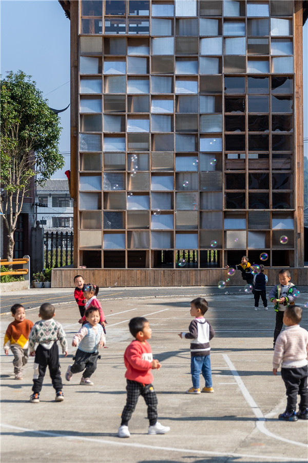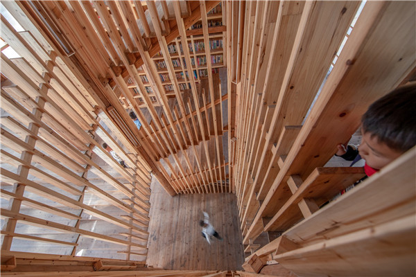 中大介紹「坪坦書屋」是3層高、面積大約180平方米,在侗族傳統「干欄」結構的基礎上重新詮釋樓梯、牆壁、窗戶和地板等元素;整棟建築的主要特色是兩個相互交錯的螺旋樓梯,外牆則由書架和可俯瞰庭院的窗戶矩陣組成,而書屋除外牆板外全用木材建造,並遵循侗族傳統木工細節。