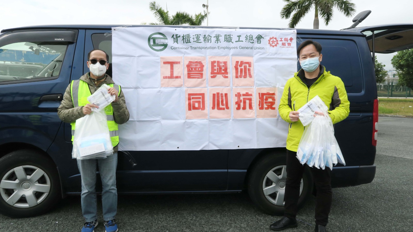 工聯會副理事長兼海港工會主席蘇栢燦,貨櫃工會主席陳迪手聯同多位義工一同到深灣口岸將防疫物資免費派發給工友。