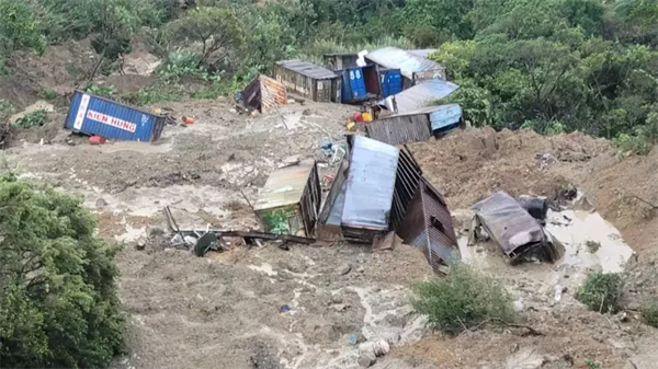 空拍畫面顯示,山頭大範圍土石崩塌,數個貨櫃還卡在山坡上,大量土石夾雜樹木滑落至下方的教忠休閒公園,衝破原本架設在籃球場周圍的鐵製圍網,幾乎半個籃球場都被土石吞沒,所幸回收場和籃球場坍塌事發當下無人,沒有人員受傷。