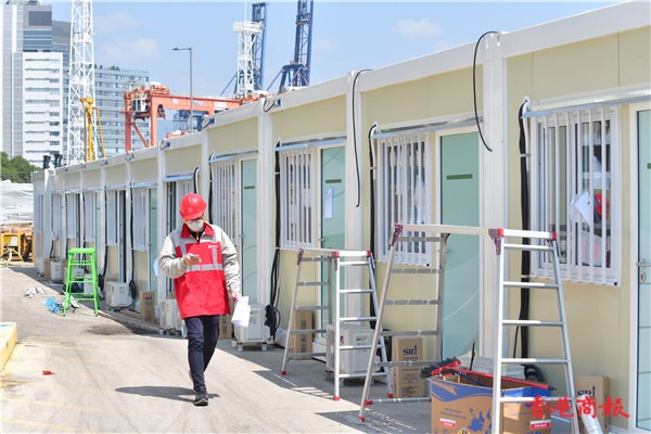 工地上有超過2000人24小時輪班施工,建築所需要的「大包廂」(用於建造隔離設施的預製件)已經陸續運到,正在拼接和安裝水電等接駁。(記者崔俊良攝)
