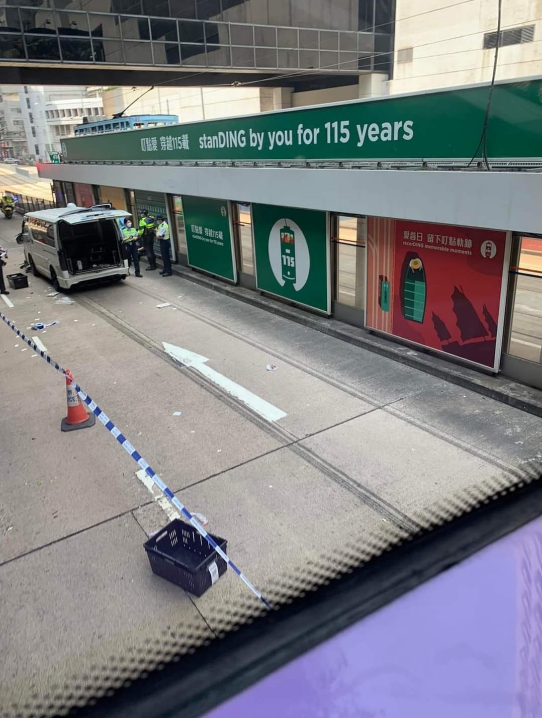 警員在現場封鎖調查,涉事客貨車車頭嚴重損毀,零件散落地上,車頭擋風玻璃爆裂。涉事司機向警員講述事發經過,意外仍在調查當中,暫列「交通意外有人死亡」處理。受意外影響,康山道往北角方向部分行車線封閉,現場交通受阻。(記者 區天海)