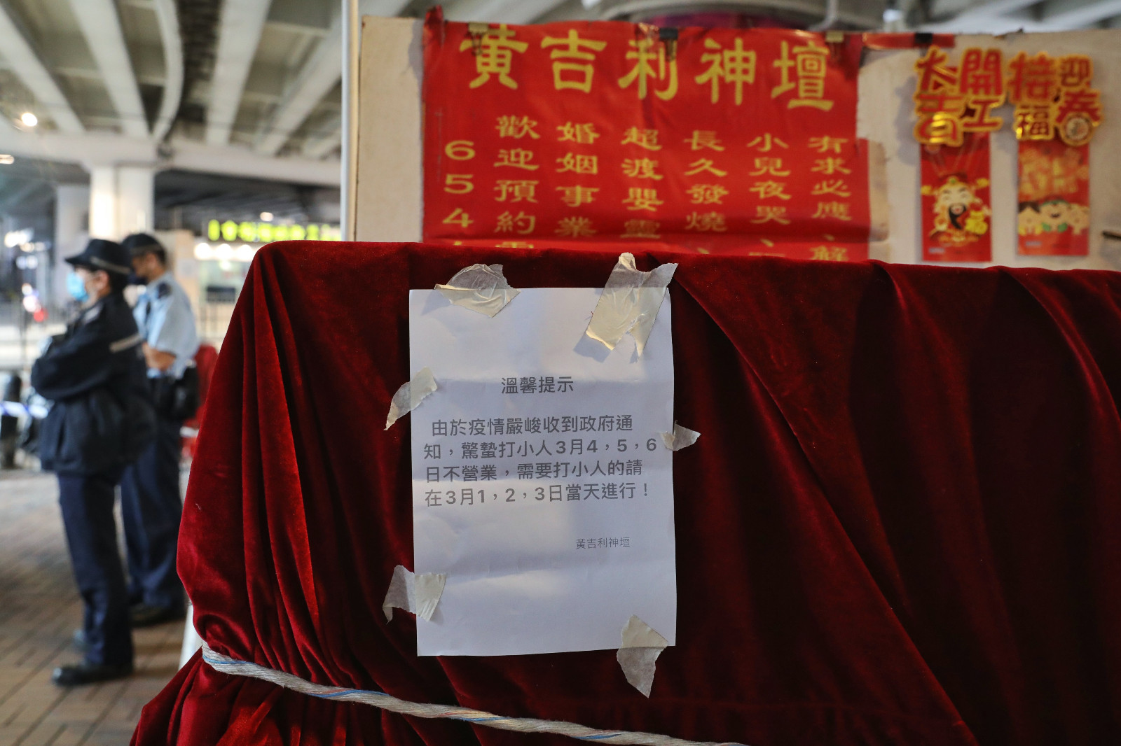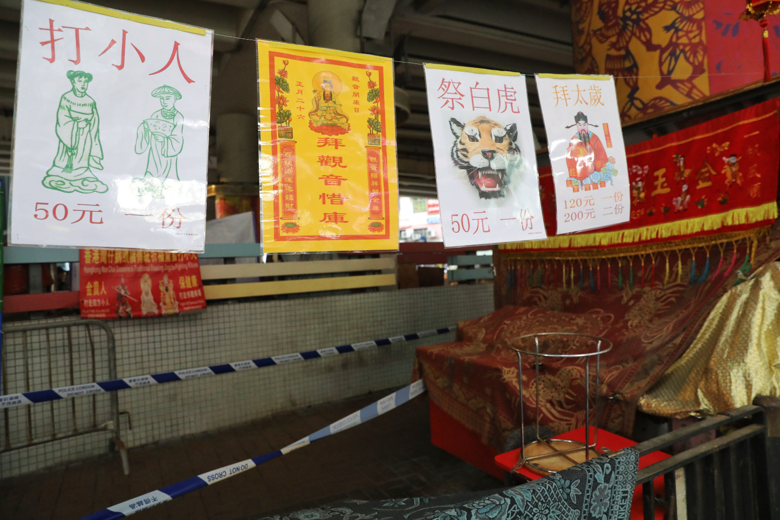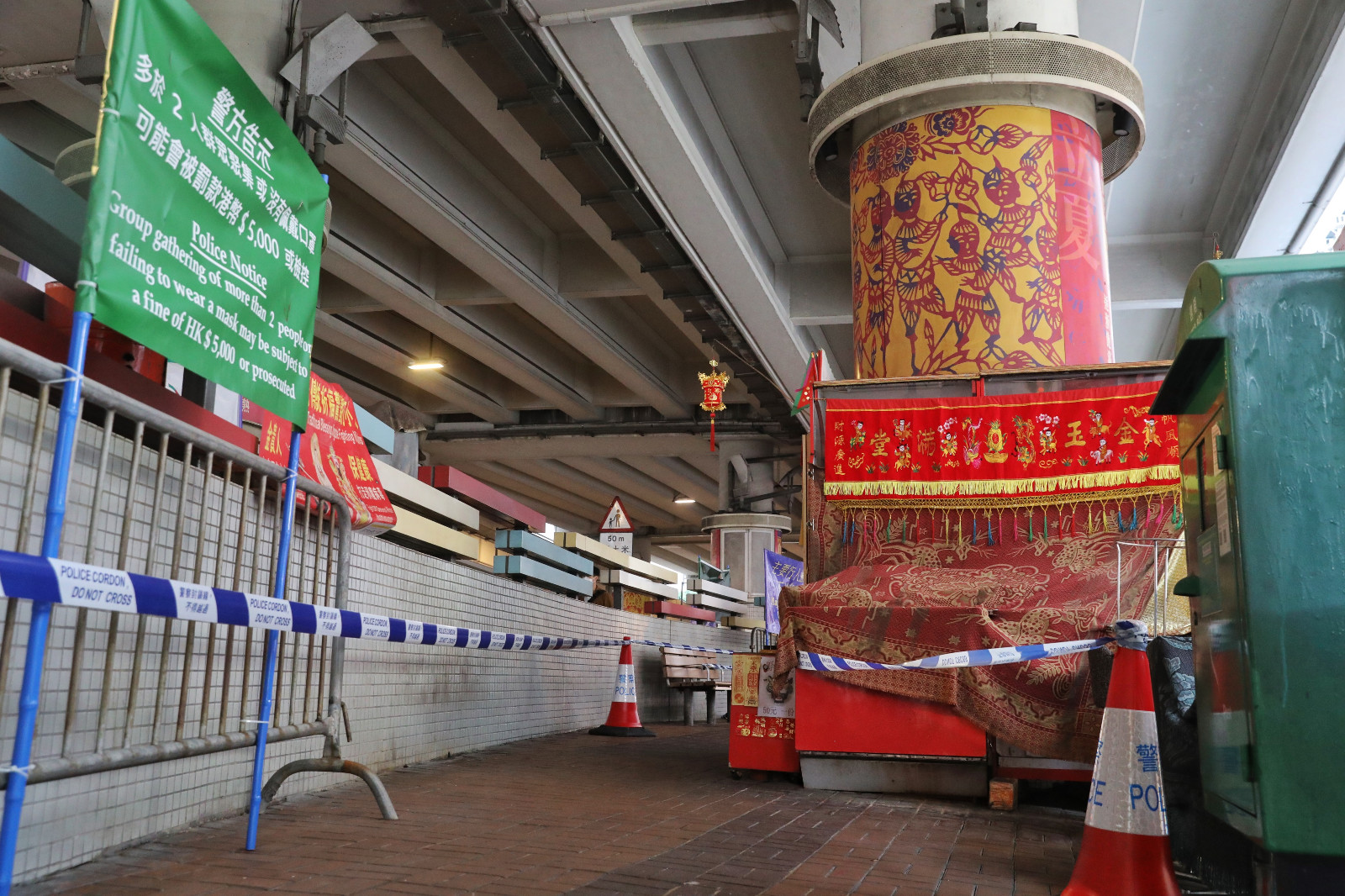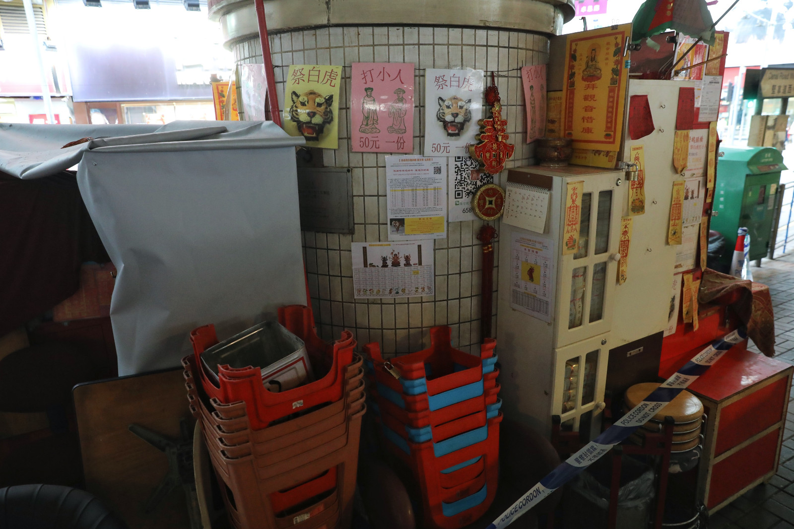 當日,「打小人」檔口前被拉起封鎖線,現場設置告示牌,提醒市民不要聚集,有警員在附近巡邏,食環署人員在現場清潔。