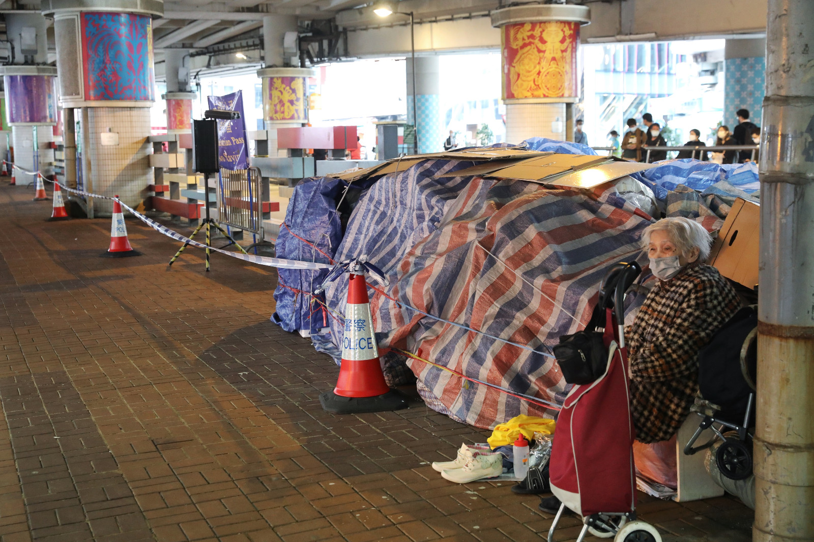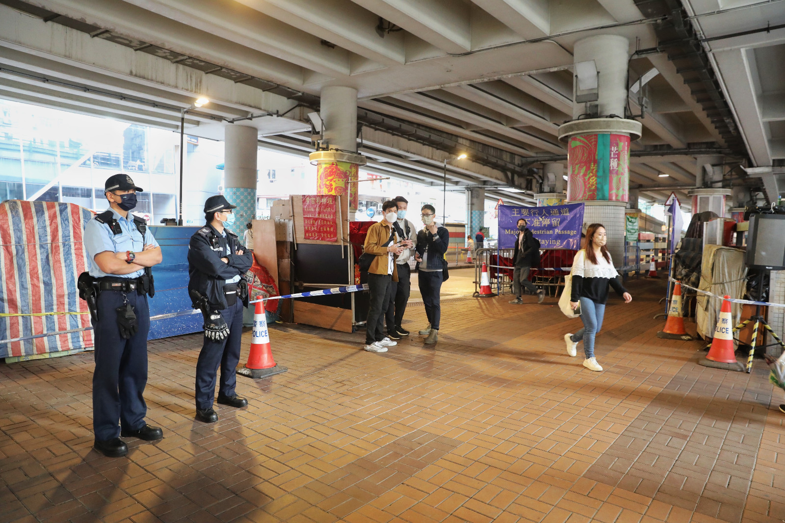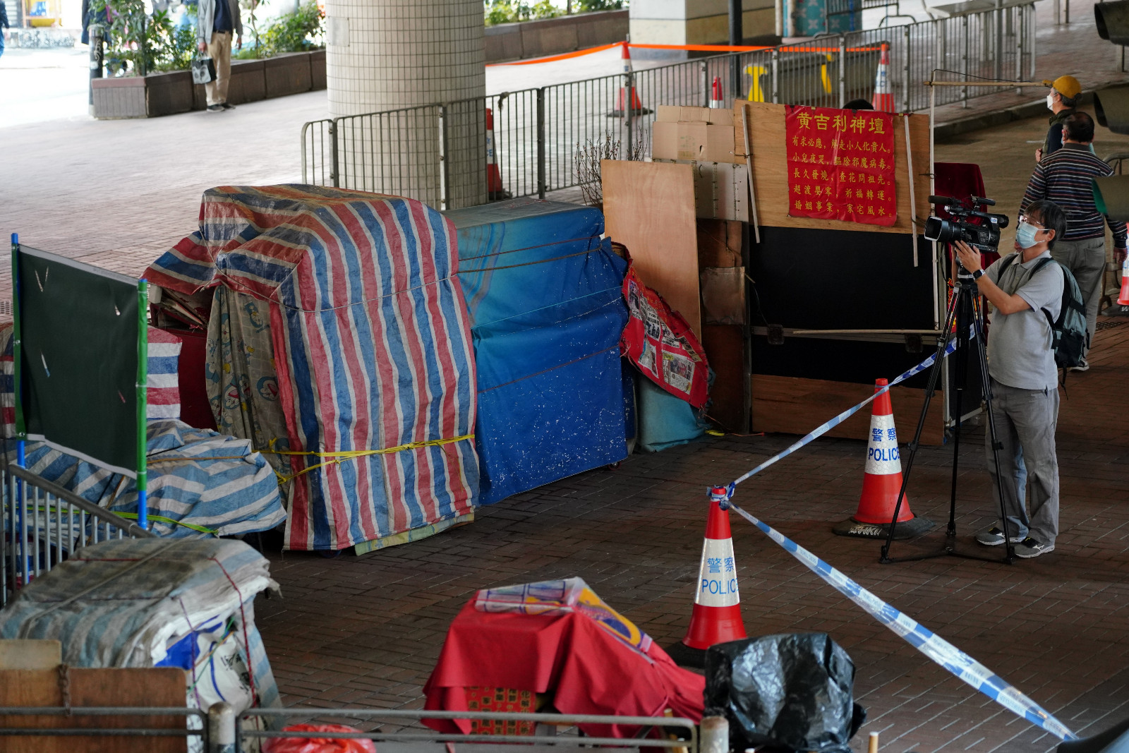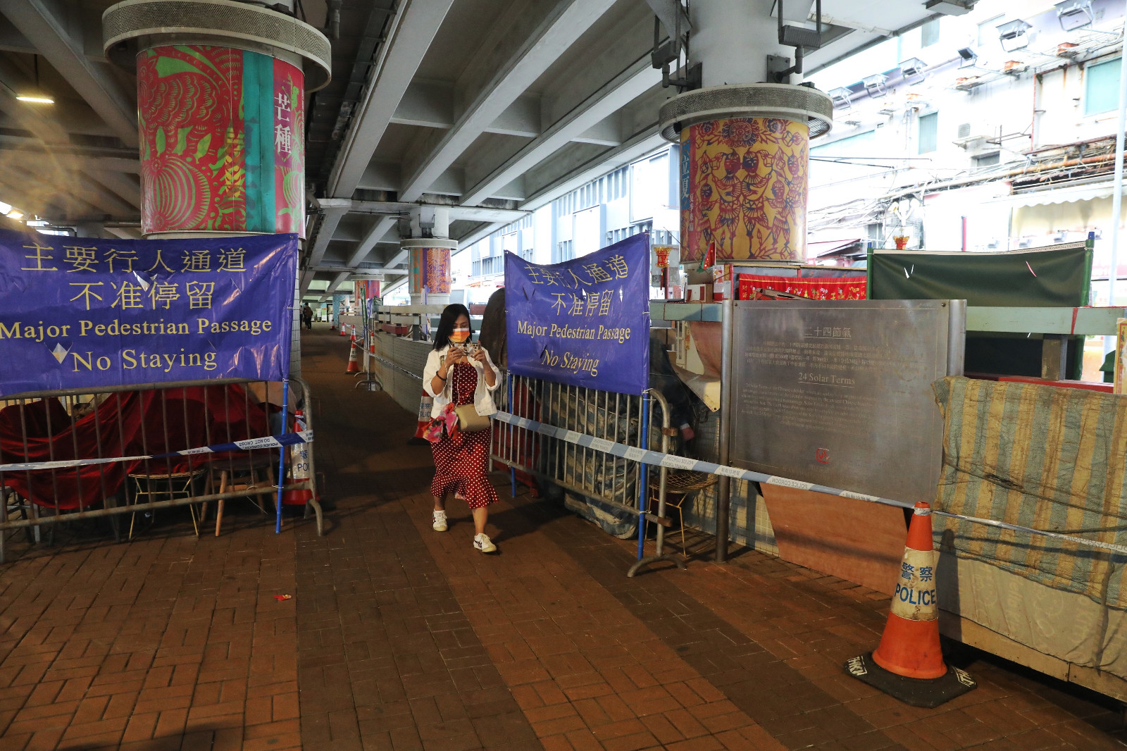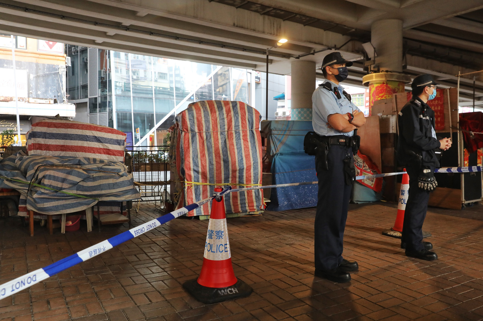 當日,「打小人」檔口前被拉起封鎖線,現場設置告示牌,提醒市民不要聚集,有警員在附近巡邏,食環署人員在現場清潔。