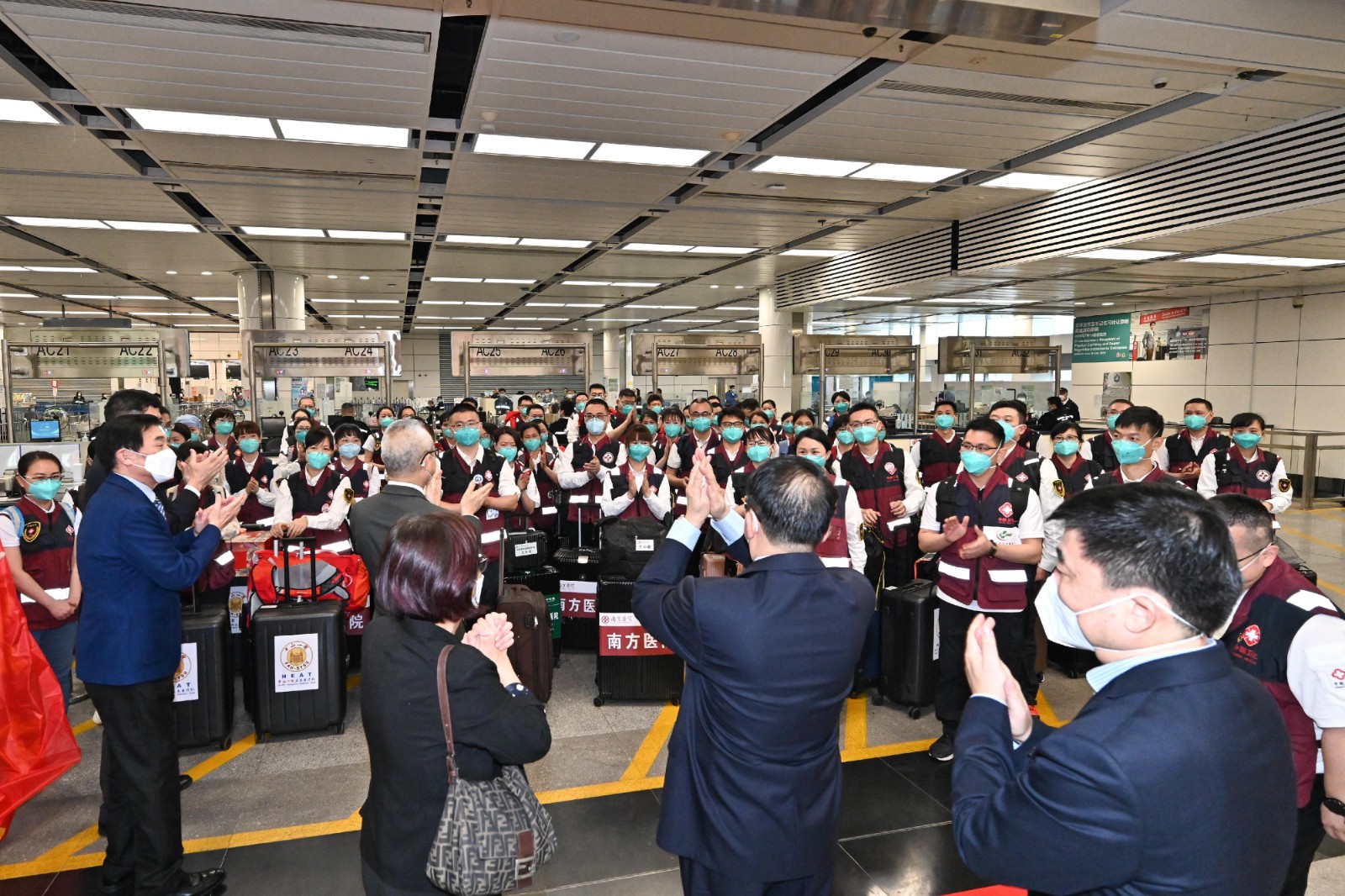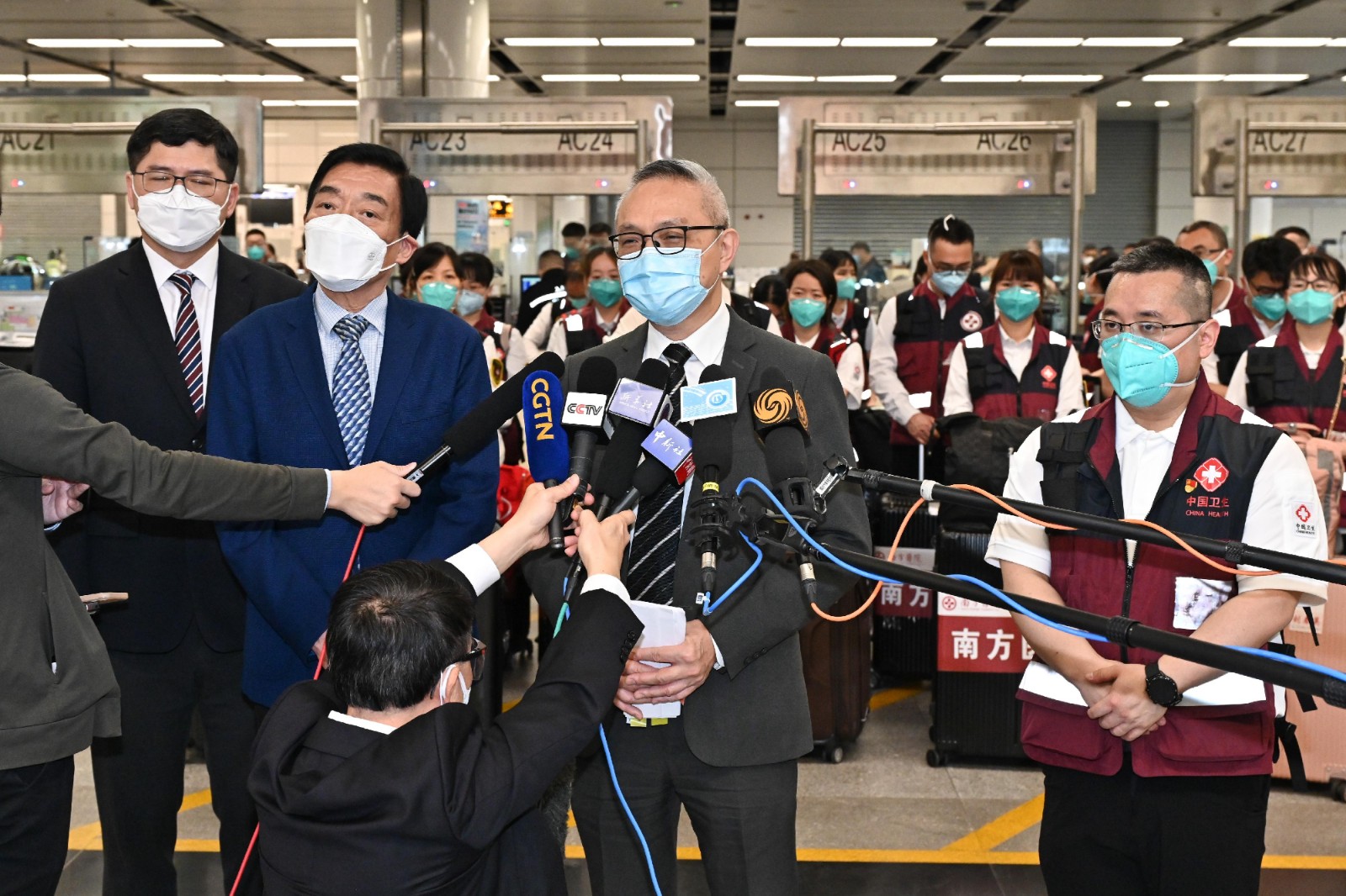 內地援港醫療隊成員今日(14日)到港,中聯辦副主任尹宗華、中聯辦協調部部長朱文、食衞局副局長徐德義醫生、醫管局主席范鴻齡和醫管局行政總裁高拔陞醫生在深圳灣口岸迎接。