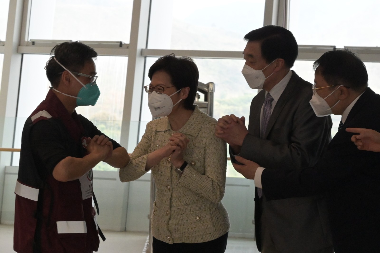 林鄭表示,衷心感謝中央及廣東省政府調派醫療隊分批馳援香港,加強香港在「減重症、減死亡」方面的抗疫工作。這支抗疫生力軍將可在短期內提升亞洲國際博覽館社區治療設施收治新冠病人的容量,提升服務規模和照顧質素。對加快整體病人流轉、紓緩公立醫院的壓力至關重要。