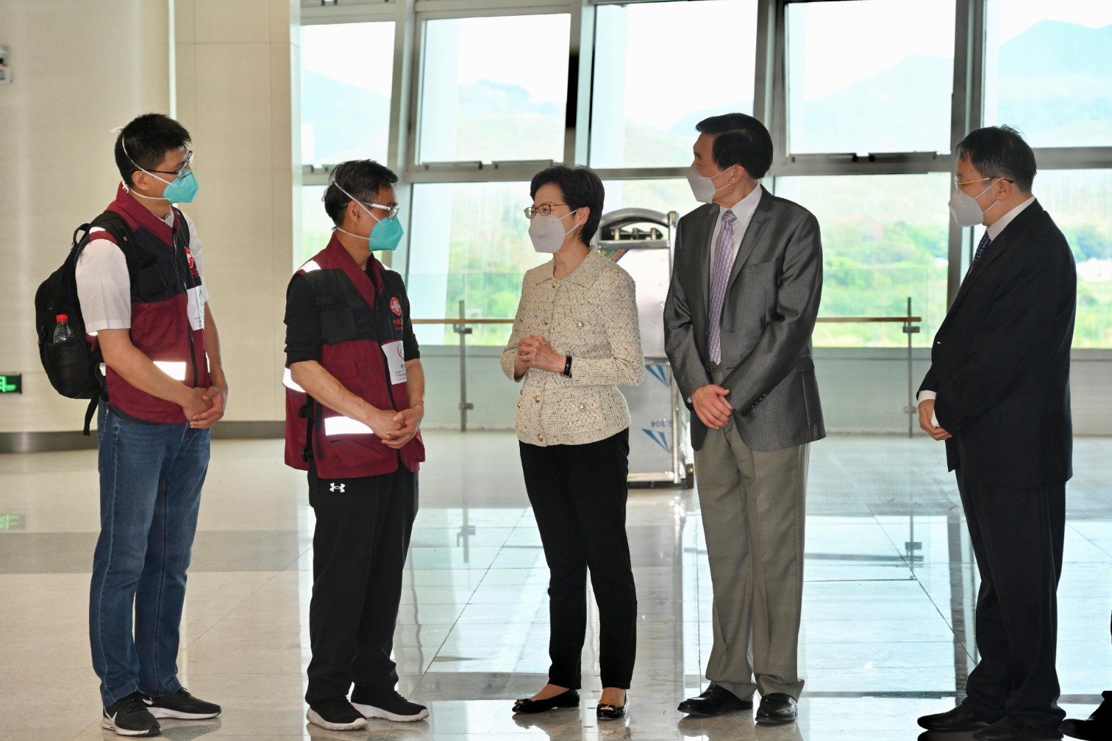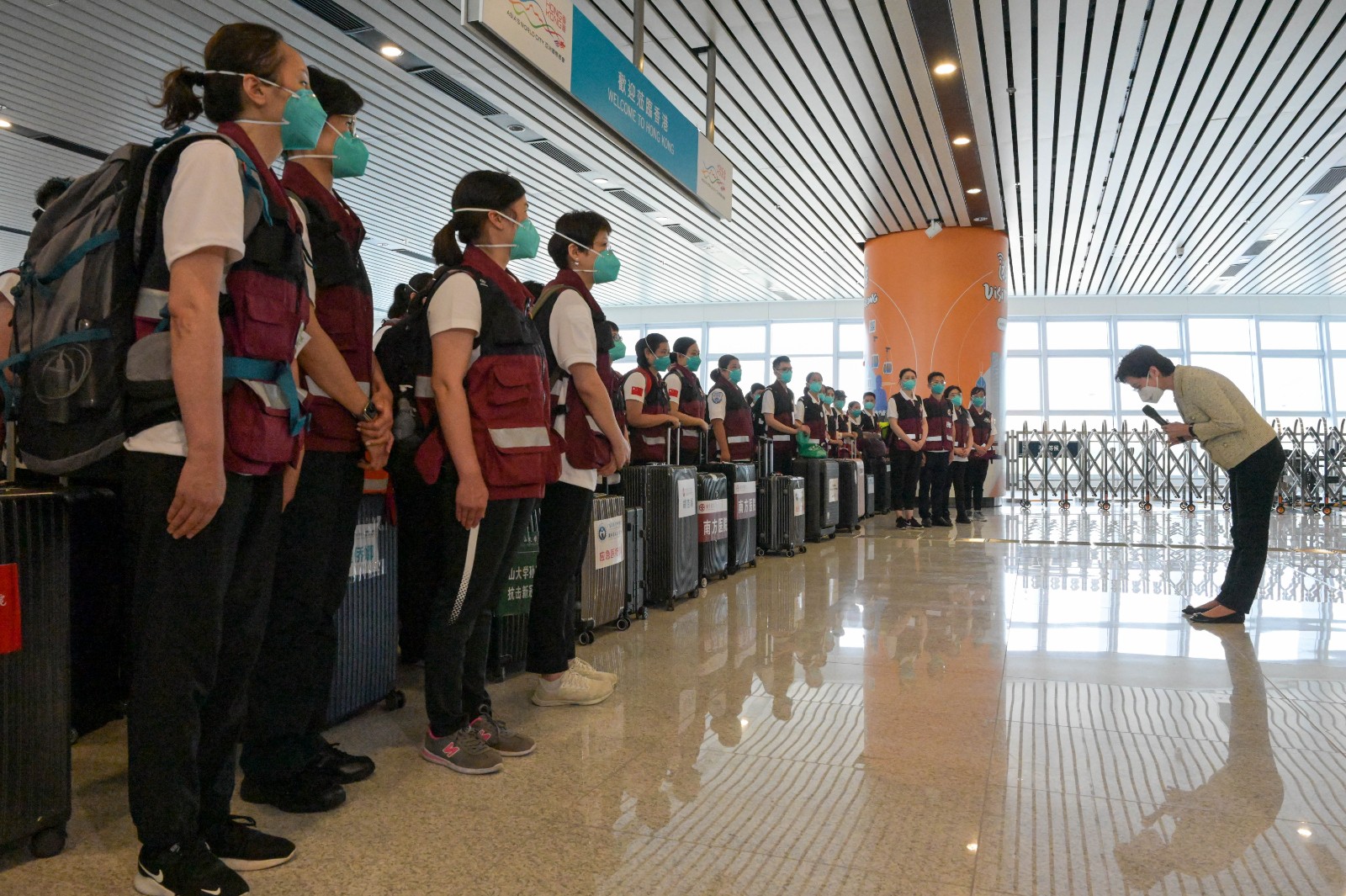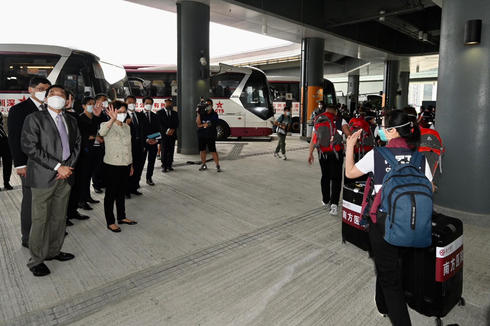 林鄭說,對醫療隊的每一位成員,放下自己手上的工作,暫時離開家人,在香港疫情十分嚴峻時,來港參與救治病人的工作,表示十分敬佩。指他們體現了一方有難、八方支援的無私精神和血濃於水的同胞情誼,林鄭謹代表特區向他們致以由衷的感謝。她深信有國家作為堅強後盾,香港定能在各界齊心努力下,早日穩控疫情。