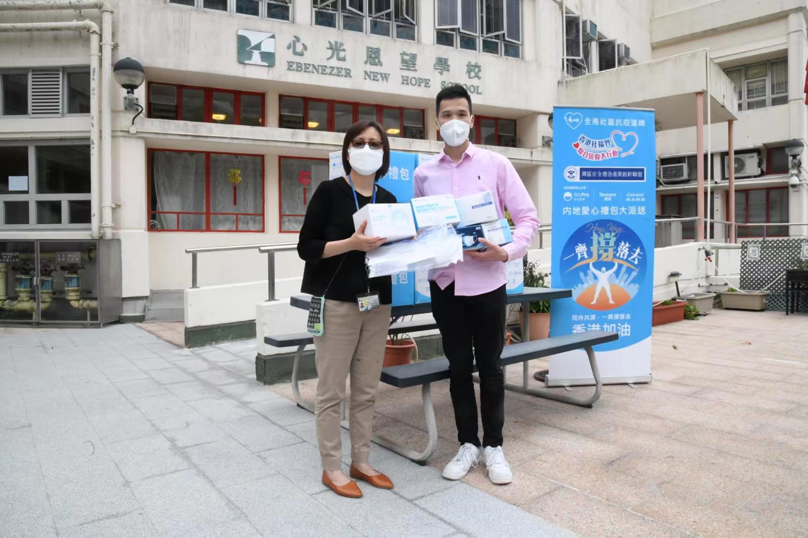 今批「愛心禮包」共有1900份,內含一次性醫用外科口罩、成人KN95口罩、兒童口罩、核酸檢測試劑、面罩、手套若干。義工隊馬不停蹄先後到3間殊學校派送物資,分別是屬於輕度智障特殊學校的「道慈佛社楊日霖紀念學校」;屬於嚴重智障學校的「保良局陳百強伉儷青衣學校」;屬於失明及多重障礙人士的「心光恩望學校」。