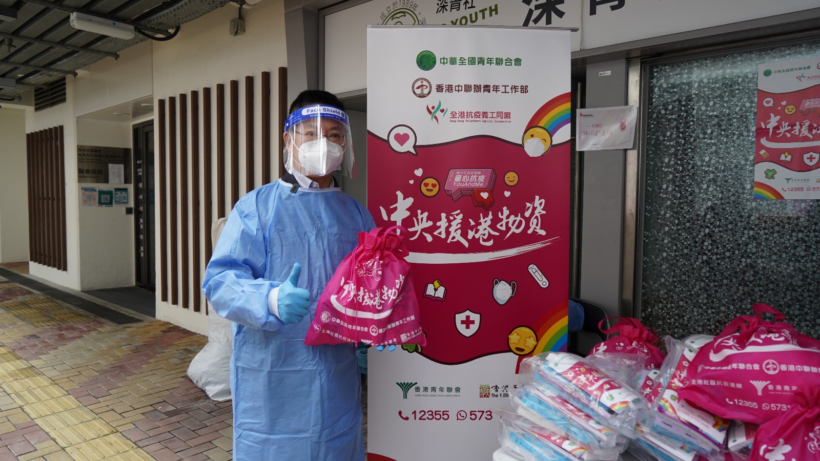 中華全國青年聯合會副主席梁宏正與幾位全國青聯委員代表中央向香港青少年家庭派發抗疫物資,看見很多年青家庭一早便到不同領取站領取抗疫包,反映抗疫包中的物資受市民歡迎。