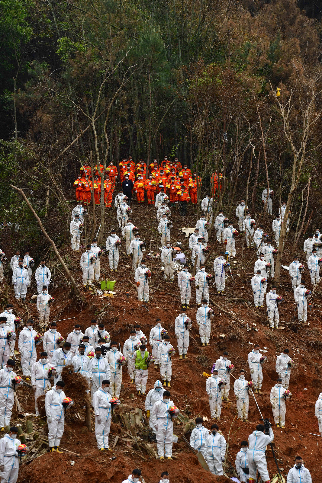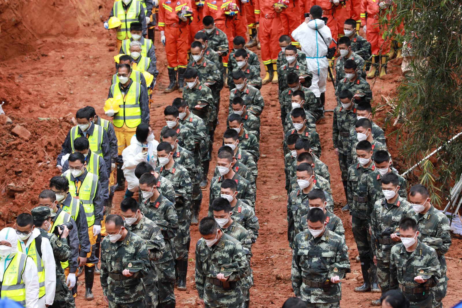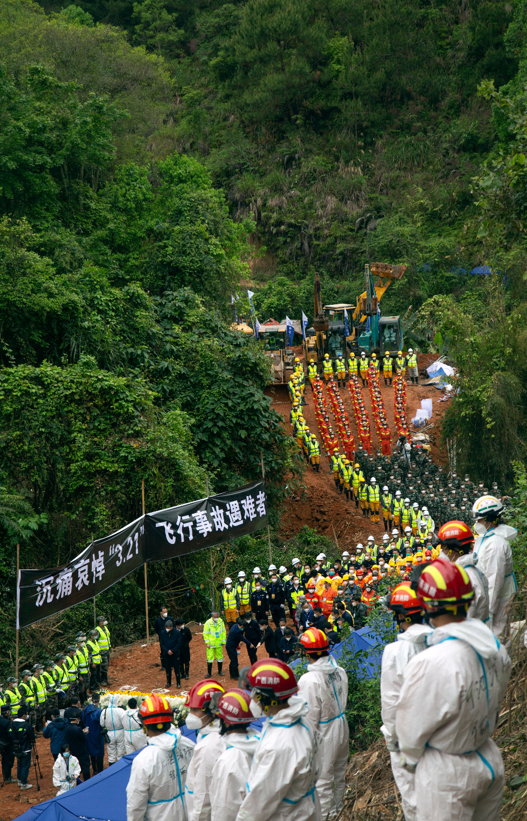 當天14時許,哀悼活動開始,全場鳴笛,「3·21」東航MU5735航空器飛行事故國家應急處置指揮部全體人員、事故現場搜救人員等面向遇難飛機方向肅穆而立,默哀三分鐘,以此寄託對遇難者的哀思。(圖源 新華社 中新社)