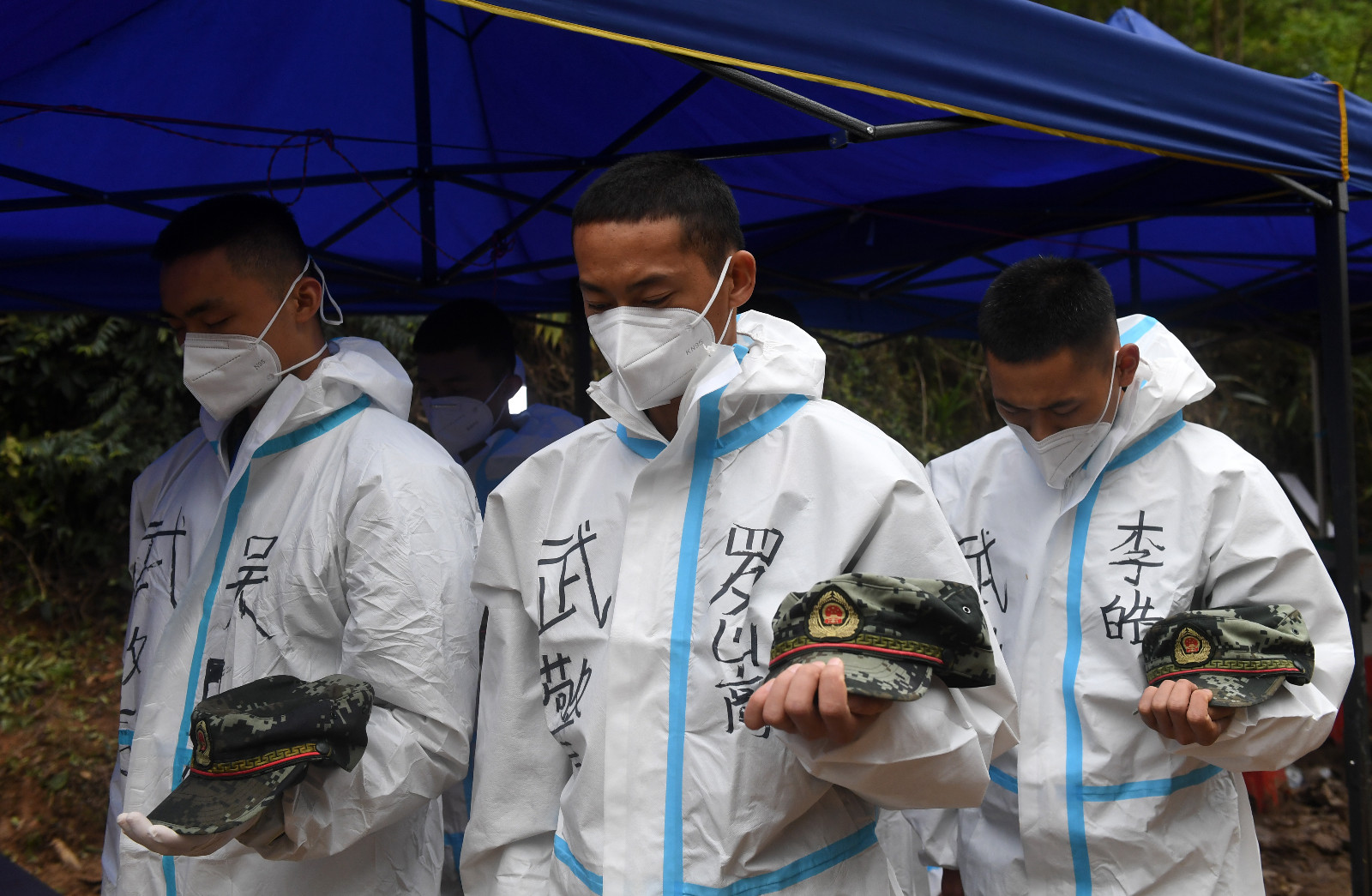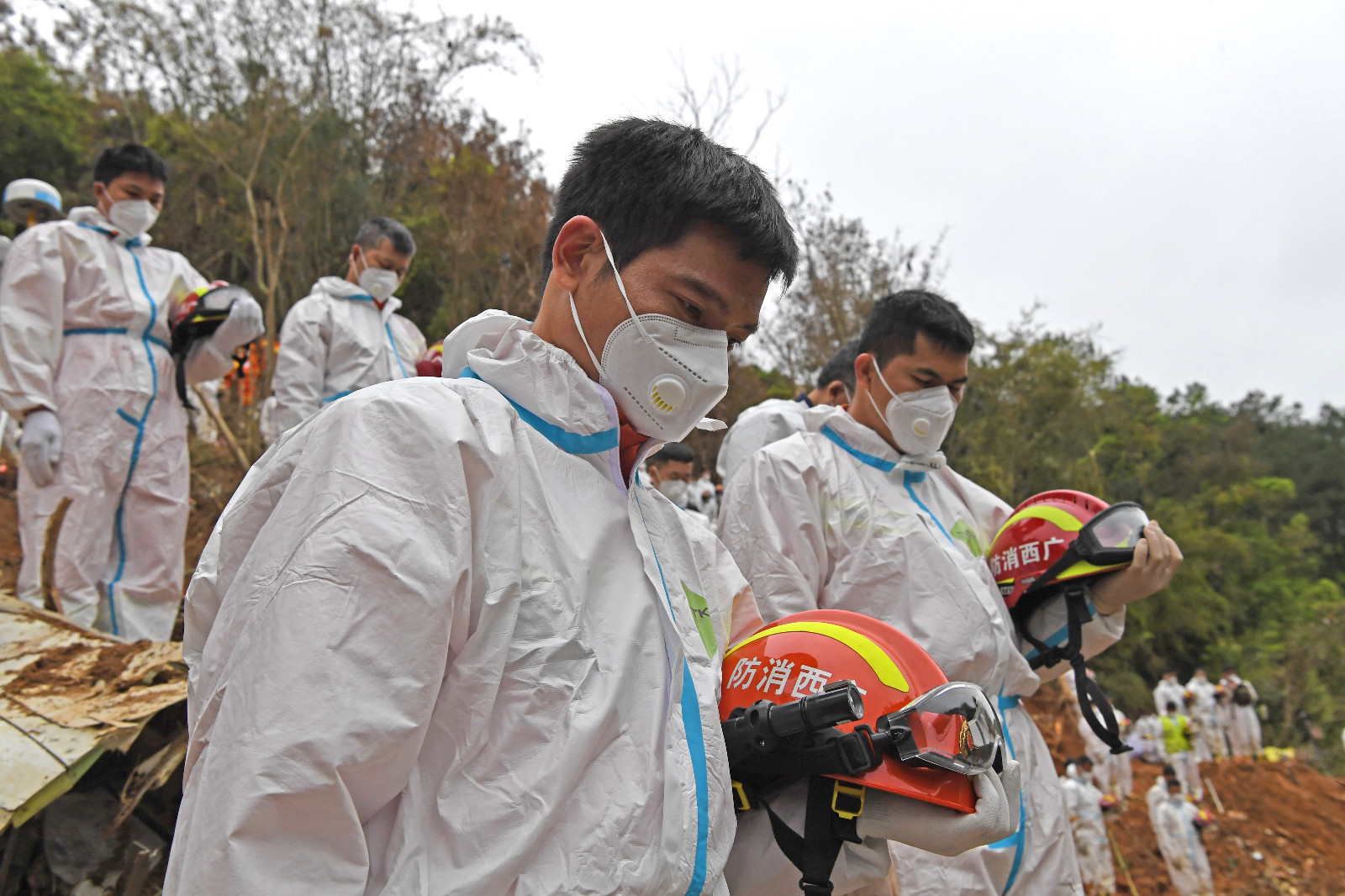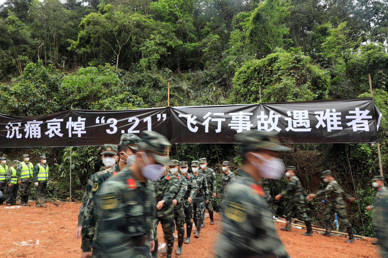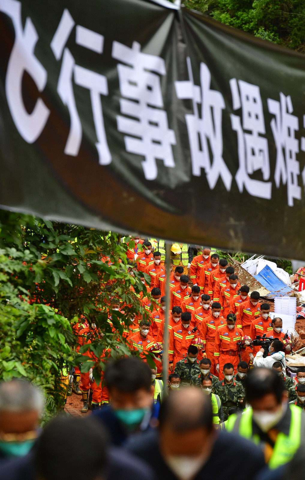當天14時許,哀悼活動開始,全場鳴笛,「3·21」東航MU5735航空器飛行事故國家應急處置指揮部全體人員、事故現場搜救人員等面向遇難飛機方向肅穆而立,默哀三分鐘,以此寄託對遇難者的哀思。(圖源 新華社 中新社)