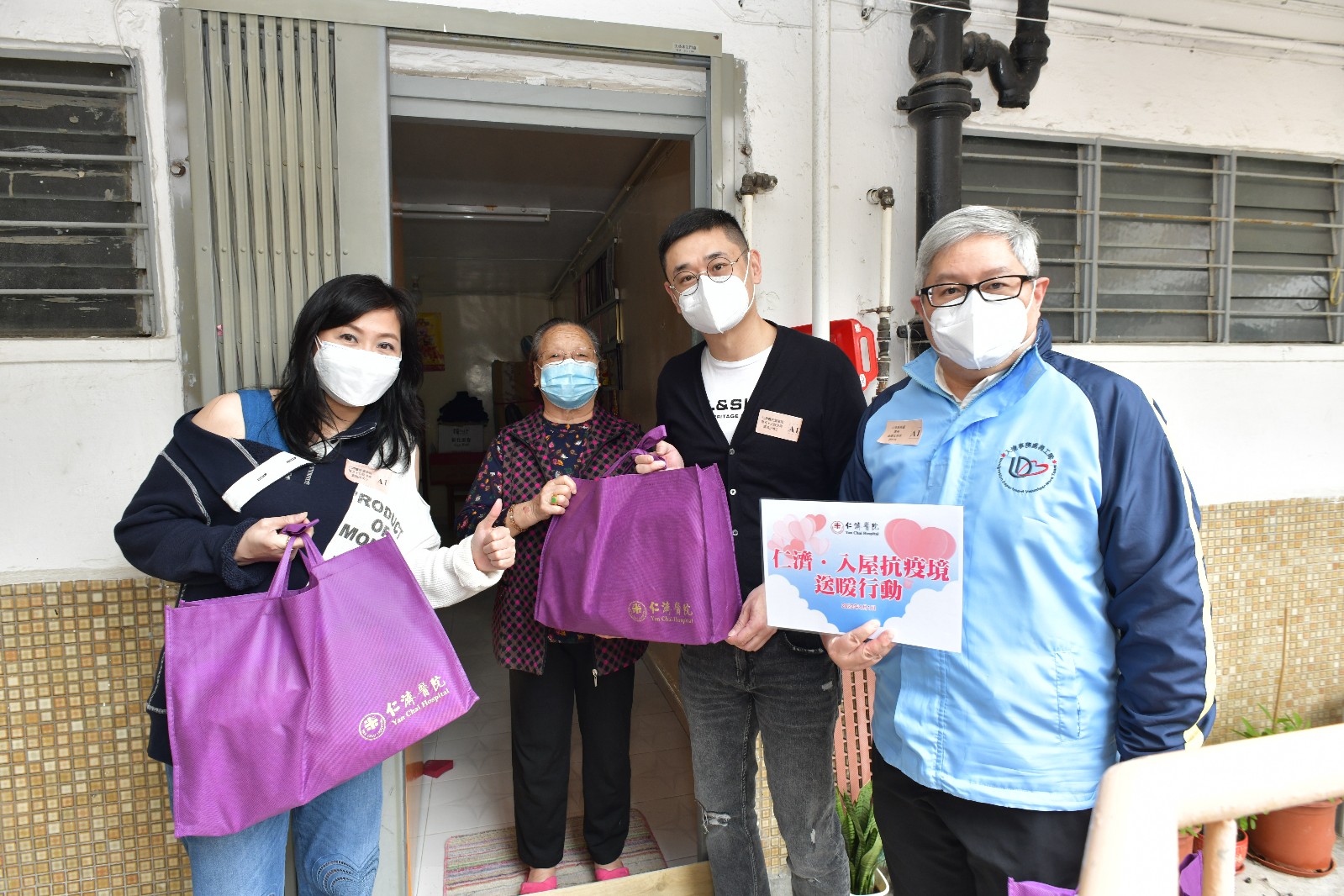 第5波新冠疫情稍有緩和,仁濟醫院董事局與入境事務處全力響應和配合中央及特區政府的抗疫工作,已於今日(1日)攜手合辦「仁濟.入屋抗疫境行動」抗疫包送贈活動,由入境事務處人員及仁濟的支援抗疫團隊,四出上門派發由仁濟醫院贊助的200個支援抗疫包予獨居或雙老長者及基層家庭並送上關愛。抗疫包內有多款抗疫物資,包括:水溶性維他命C、消毒搓手液、快速檢測劑、口罩、保健湯包及乾糧等。