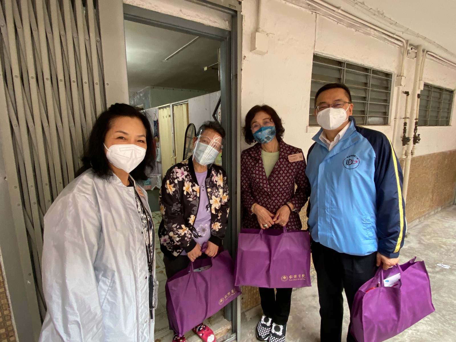湖景邨長者收到由入境事務處郭俊峯副處長(右一)、仁濟醫院董事局孫蔡吐媚副主席(右二)及蔡高燕姬總理(左一)送上的支援抗疫包表示感謝。
