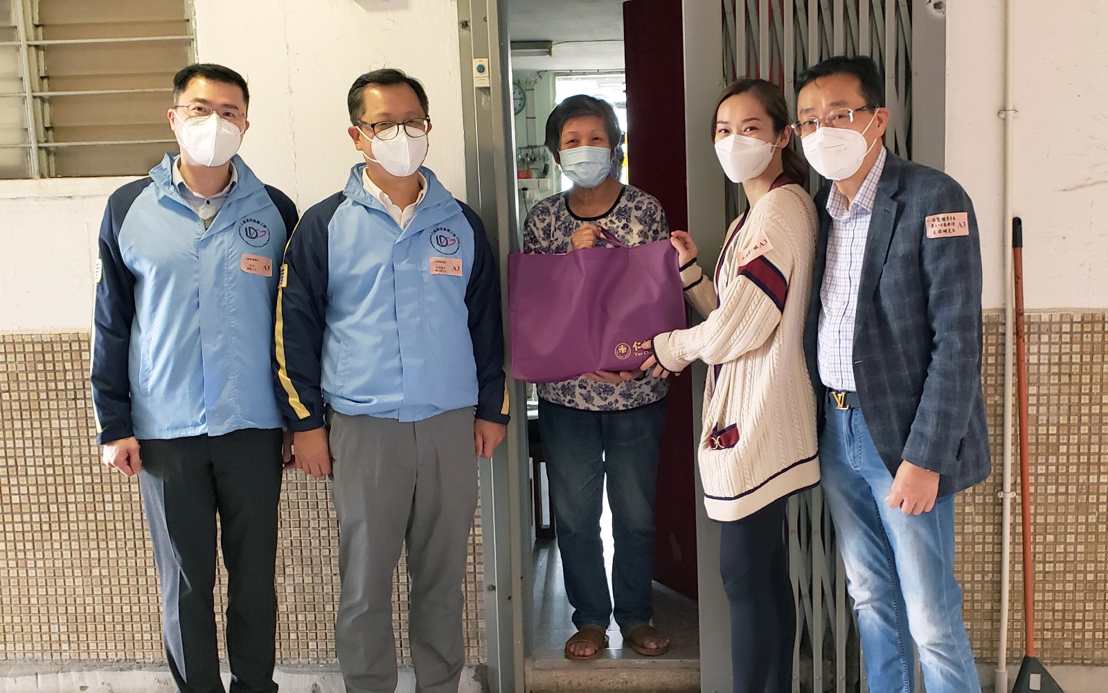 頂圖:支援抗疫團隊今日在屯門送贈支援抗疫包予獨居、雙老長者以及基層家庭。