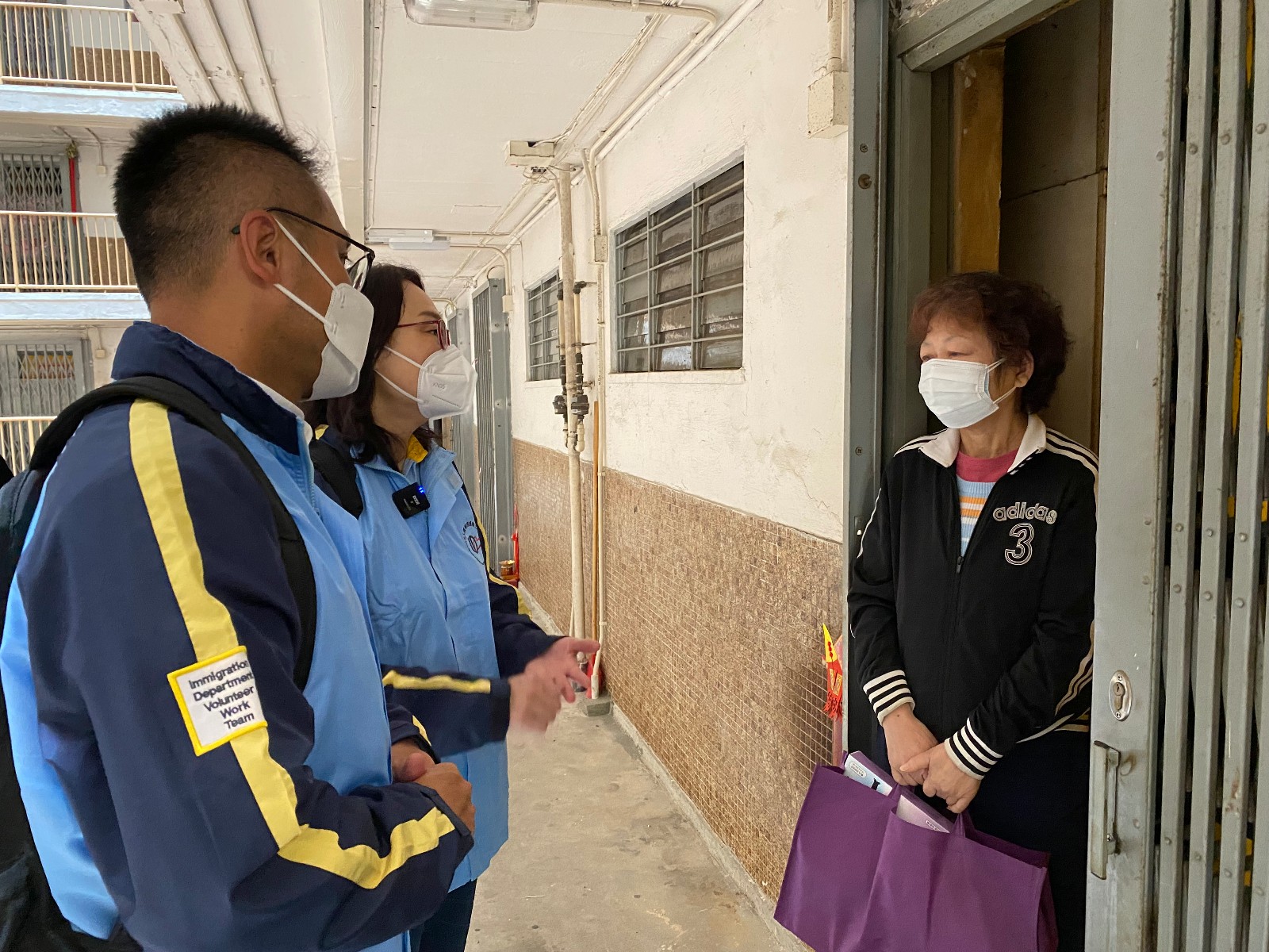 入境處人員參與「仁濟.入屋抗疫境行動」,到湖景邨為長者送上支援抗疫包。