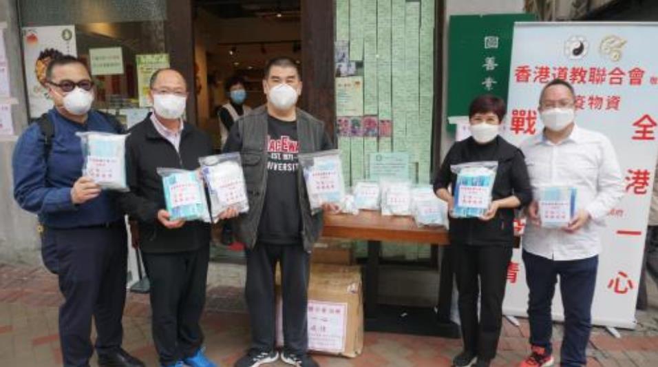 面對當前的疫情,香港道教聯合會心繫香港市民。本會侯永昌副主席、梁偉明理事、劉錦華理事、余兆坤理事與陳國鏗總幹事今日(4月1日)聯同土瓜灣「圓善素食」餐館向區內居民派發數萬套防疫包,包括外科口罩、N95 口罩、快速測試劑、搓手液、連花清瘟膠囊等抗疫物資,幫助區內居民抗疫。