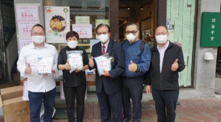 本會梁偉明理事、劉錦華理事、余兆坤理事、陳國鏗總幹事向市民派發抗疫物資。