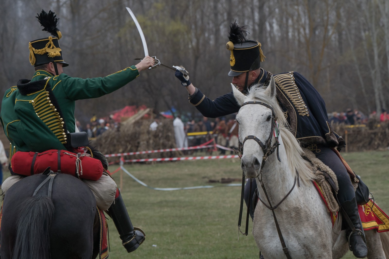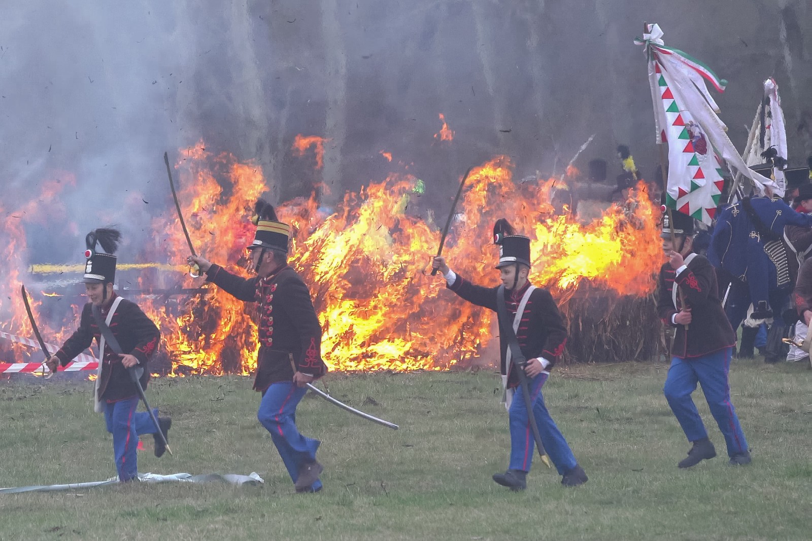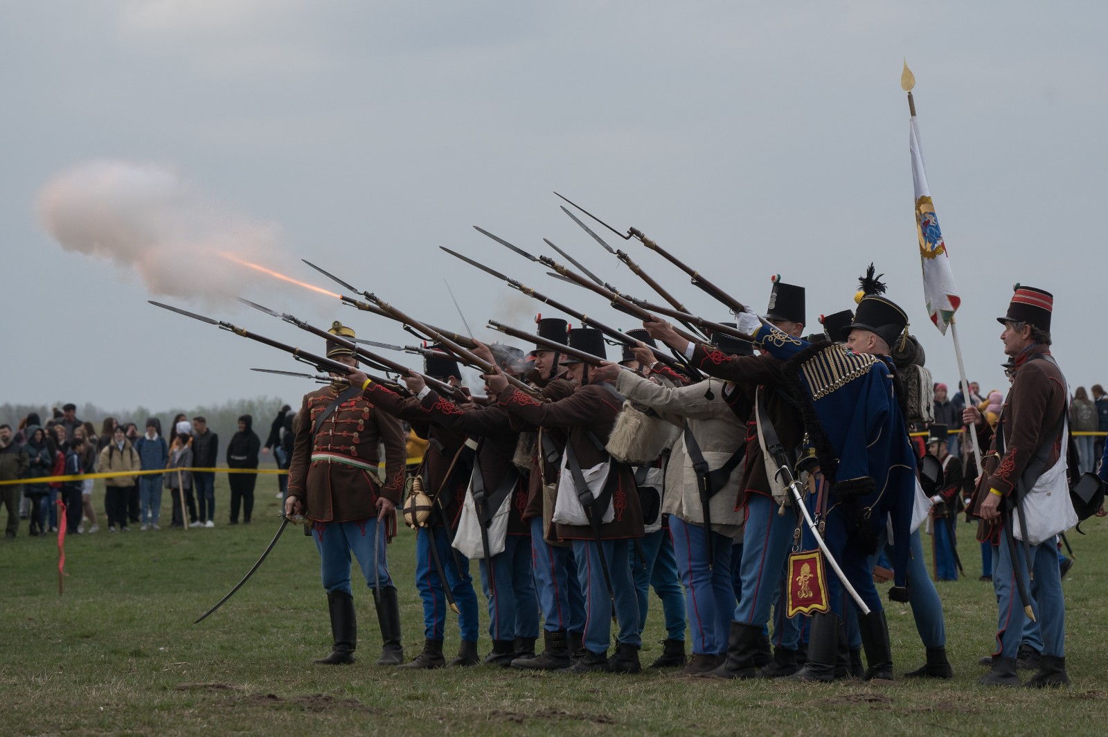 4月4日,在匈牙利佩斯州的塔皮歐比奇凱,人們身著當年的服裝再現1849年4月4日發生在這裏的塔皮歐比奇凱戰役場面。