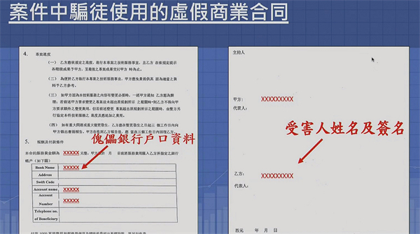 騙徒其後開始要求受害人交出保證金,要求轉款共4600萬元到一個指定戶口, 該戶口同是假合同內的戶口號碼,最後受害人與家人講出事件揭發被騙報警。