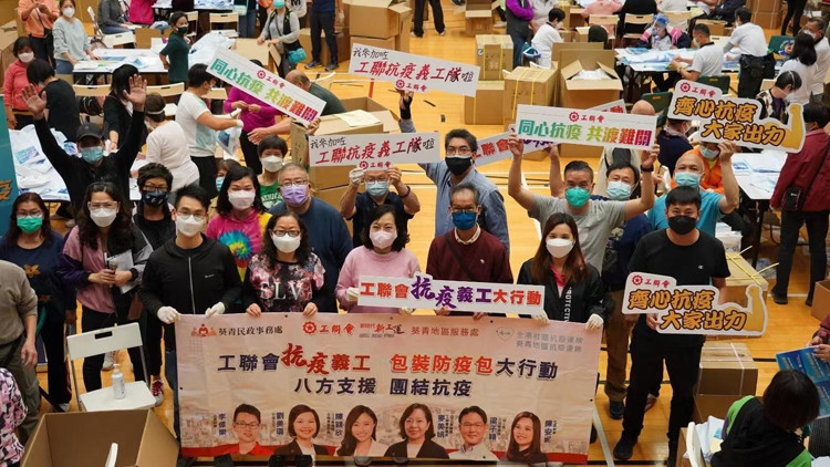 抗疫最寶貴的是信心,最重要的是團結,最迫切的是行動。在2月疫情爆發的緊急關頭,工聯會率先組織抗疫義工大行動,義工來自各行業各階層,人數已超過1700人。為清除工友對疫情的恐慌,以及他們染疫後的無助心理,工會義工堅持提供服務,持續為工友打氣。五波疫情至今,各屬會通過熱線關心及慰問會員40多萬人次,向會員市民發出防疫抗疫訊息500萬條次。工聯會吳秋北會長、黃國理事長等負責人,聯同建造業、服務業、運輸業、公共事業、百貨、餐飲等系統工會,開展抗疫物資密密送,組織義工到地盤工地、碼頭口岸、百貨公司、巴士和的士站等地,向建築工人、司機、保安、清潔員等一線工友派發抗疫物資。義工們每日冒著感染的風險,奔走在前線,忙碌於社區,包裝分發抗疫物質,上門支援感染市民逾2萬戶。並特別組織了青年義工隊,協助單親家長協會上門送物質給單親媽媽。先後有數百名義工在支援工作中不幸感染,也堅持通過電話、網絡為市民傳遞資訊、解答疑問,很多義工居家治療康復後又馬上投入抗疫工作,救急扶危、無怨無悔的奉獻精神感動著越來越多義工參與。義工溫先生放棄自己的工作,每日開車到各區送防疫包,物資緊缺的時候,也自掏腰包購買物資送給有需要的前線工友。他說:疫情當前,能幫就幫,這是工會應該做的事情。像溫先生般的義工,在工聯會「抗疫義工隊」中比比皆是。工聯會副會長麥美娟說「很多人都是看到我們的義工行動,深受感動而主動加入,第一次參加工聯會義工行動的就達數百人。