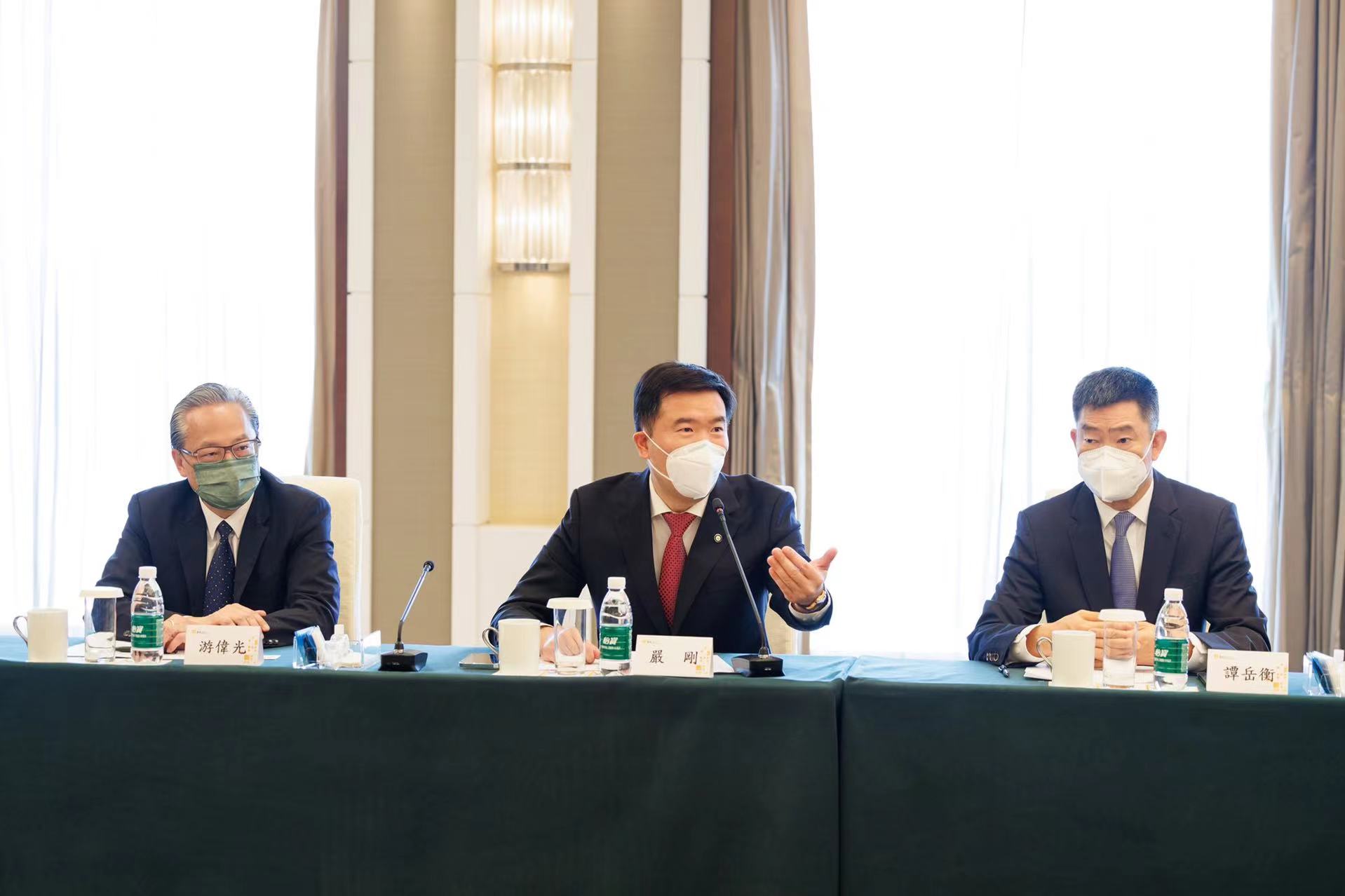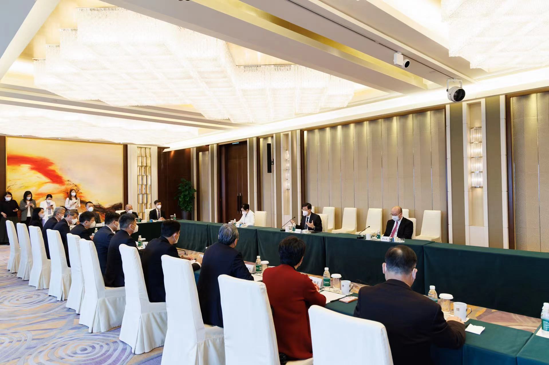 李家超今早來到華潤大廈,拜會第四界別中國企業協會十多位選委會委員,介紹施政理念及爭取支持。立法會議員譚岳衡、李浩然、嚴剛及中資企業16位代表出席了座談會。