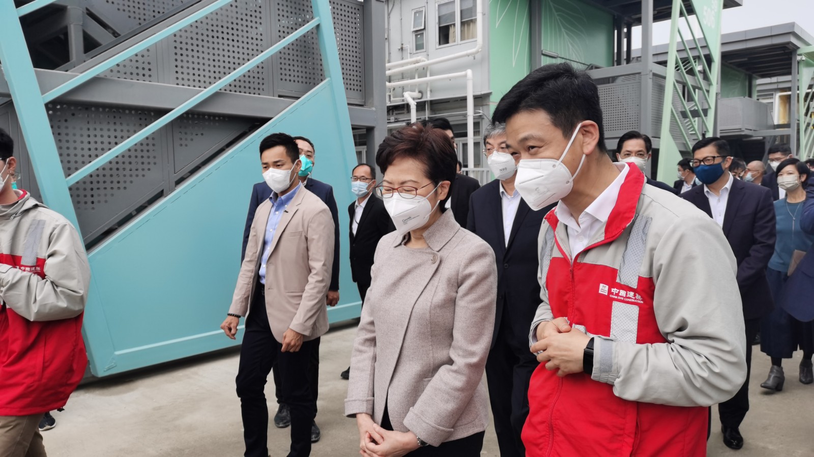 行政長官林鄭月娥隨承建商參觀項目及單位,聽取承建商講解設施的設計及運作。