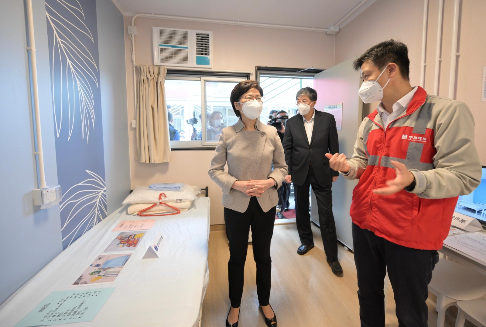 林鄭月娥指出,竹篙灣社區隔離設施作為中央援建項目中規模最大的一個,將在香港應對疫情工作中肩負重任,這個設施合共提供約7000個房間,涉及約14000個床位。由於規模龐大,項目會從今日起分階段由中國建築交付使用;今日交付使用的首批設施約有1000個房間,涉及約2000個床位。