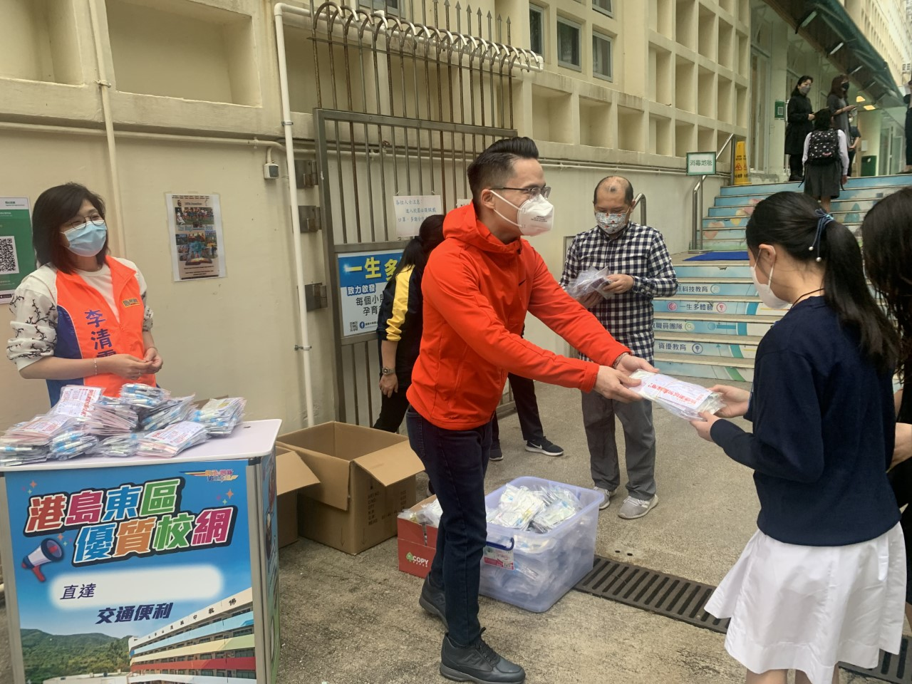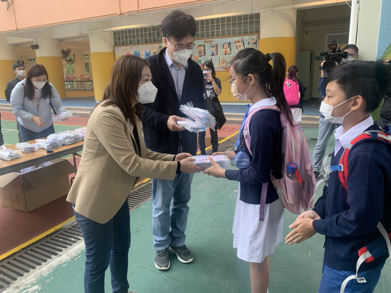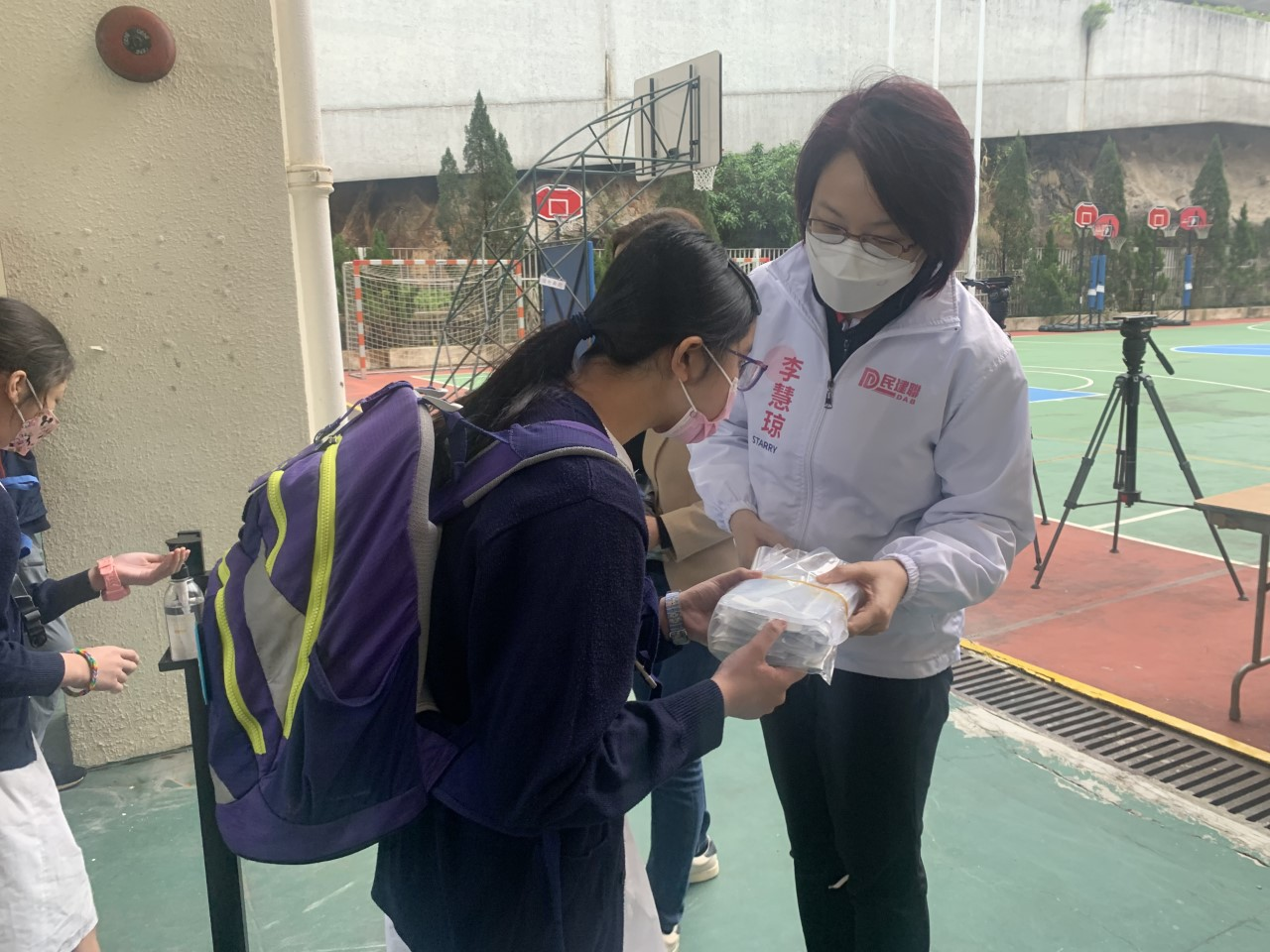 學校昨日(19日)起分階段恢復面授課堂,學生及教職員回校前必須完成快速檢測。民建聯主席兼立法會議員李慧琼、民建聯教育事務發言人兼立法會議員郭玲麗、民建聯港島東立法會議員梁熙、民建聯東區支部主席洪連杉、區議員李清霞,今日(20日)到佛教中華康山學校向學生派發快速檢測包。
