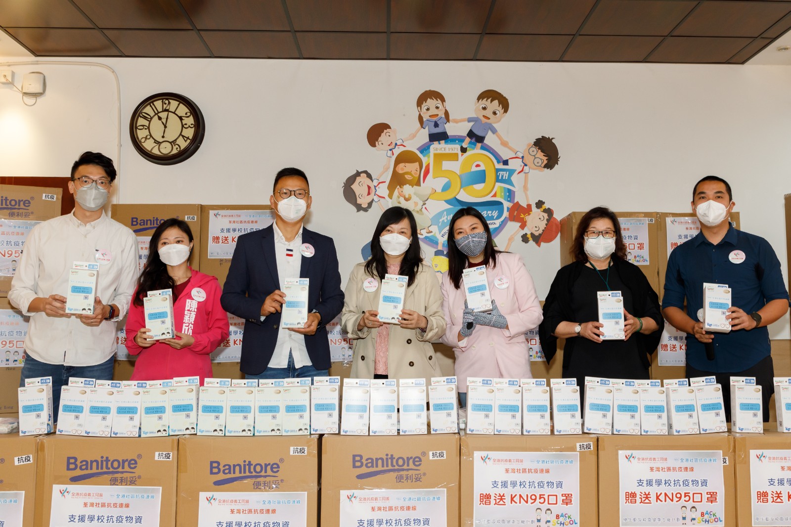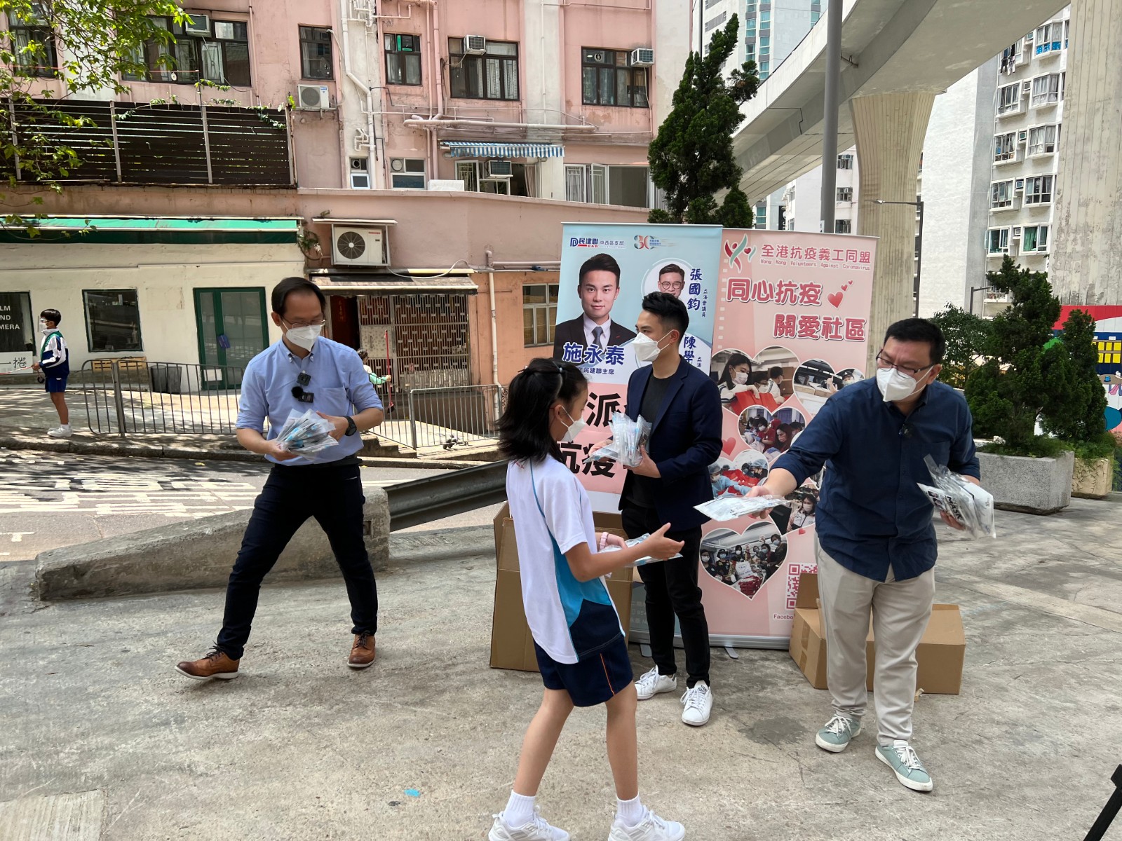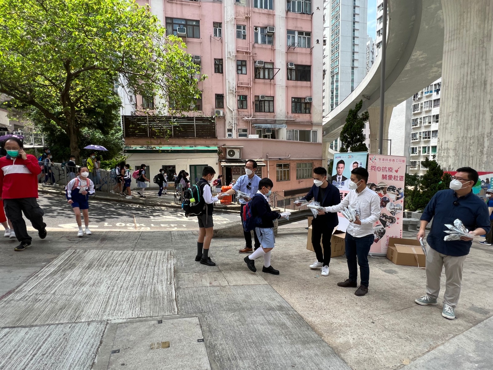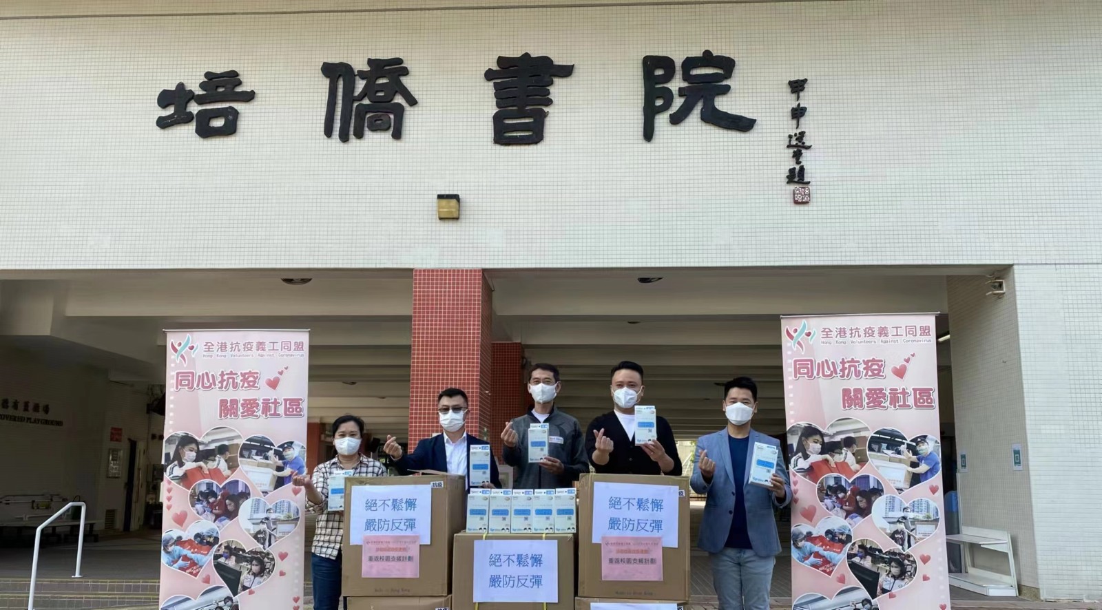 在沙田培僑書院,新社聯沙田地委會主席鄧開榮、立法會議員李世榮、民建聯沙田支部主席祝慶台等出席活動,謝秉善副校長代表書院接收1.08萬個N95口罩及1600份快速抗原檢測劑。