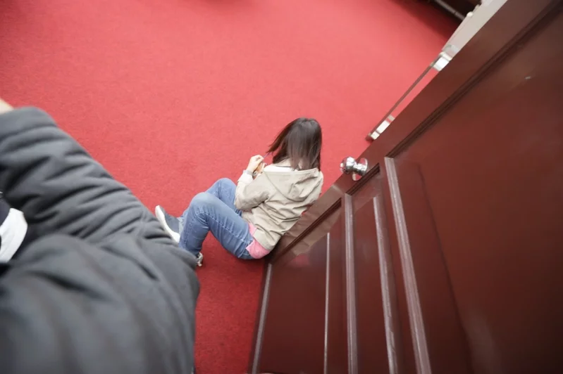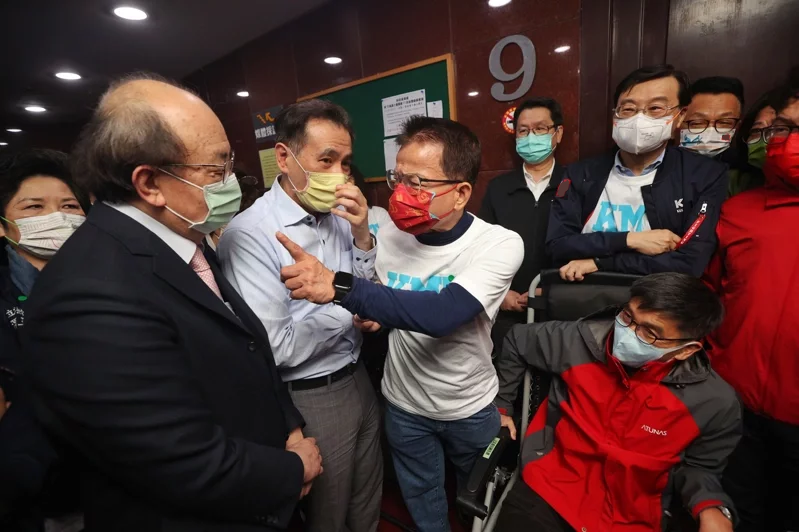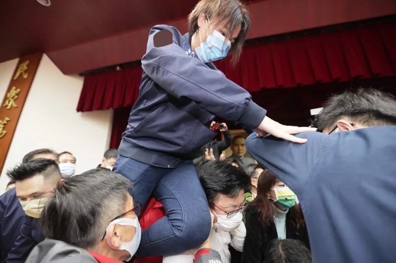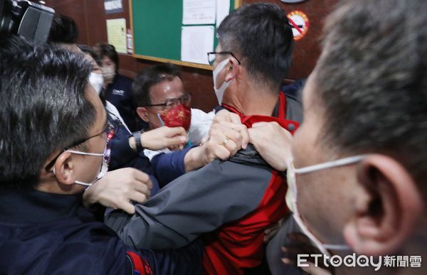 民進黨立委沈發惠最終成功搶佔主席台,他還用雙手環抱主席台麥克風,防被國民黨立委搶走位子。