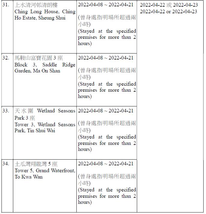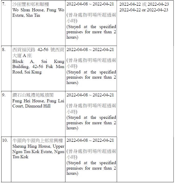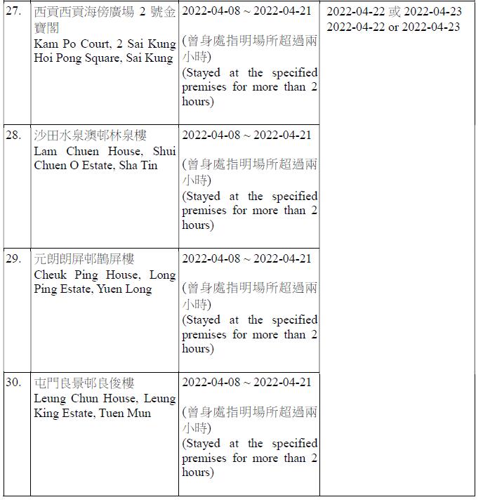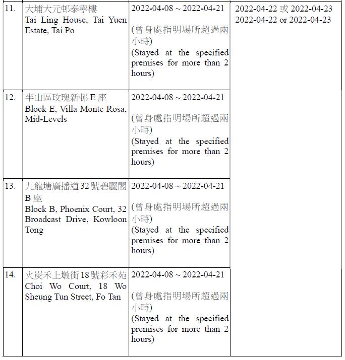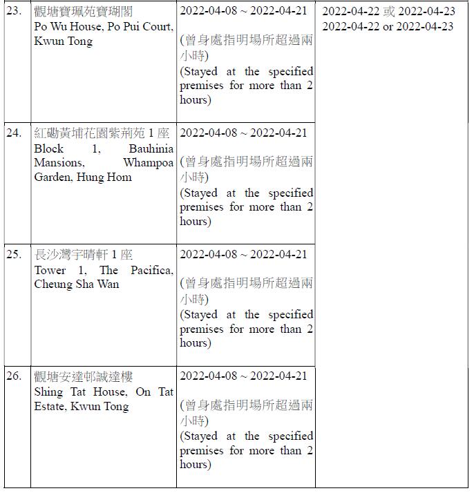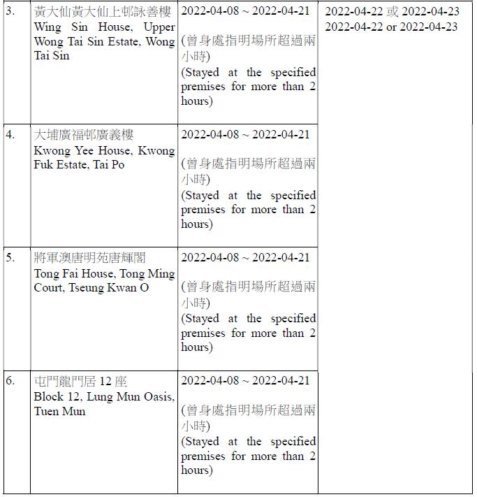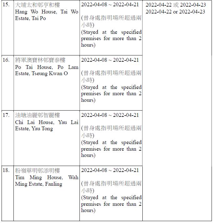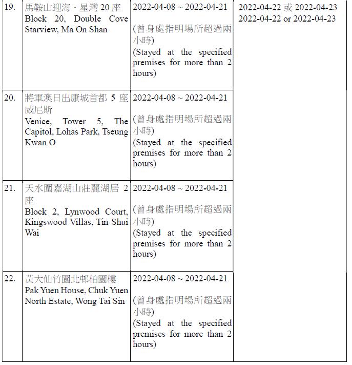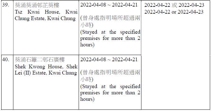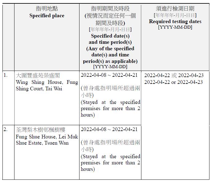 因應多宗陽性檢測個案,港府今晚(21日)就強制檢測公告刊憲,要求於指定期間曾身處40個指明地方的人士接受核酸檢測,大圍豐盛苑榮盛閣、荃灣梨木樹邨楓樹樓、黃大仙黃大仙上邨詠善樓、大埔廣福邨廣義樓及將軍澳唐明苑唐輝閣等大廈。