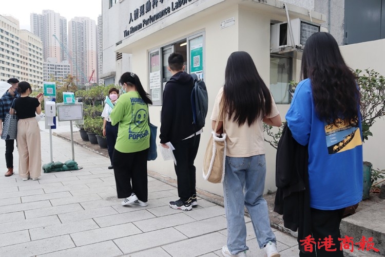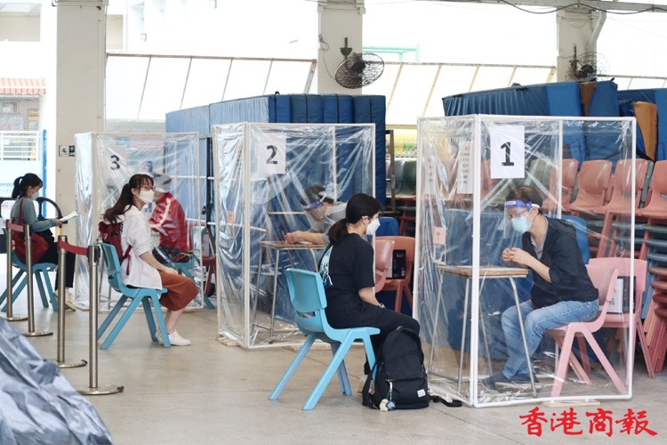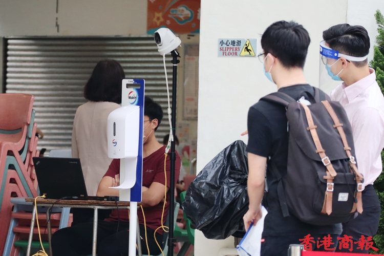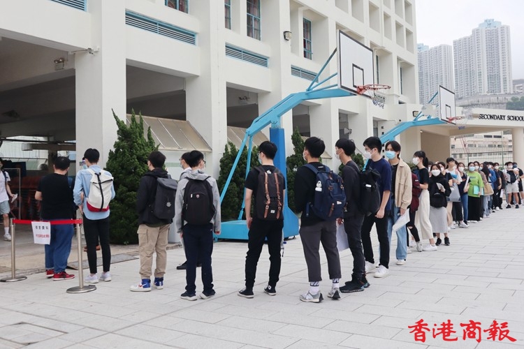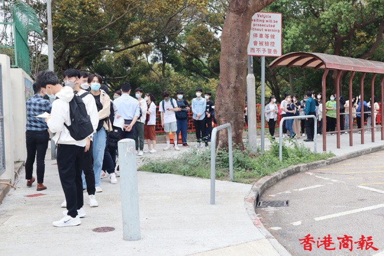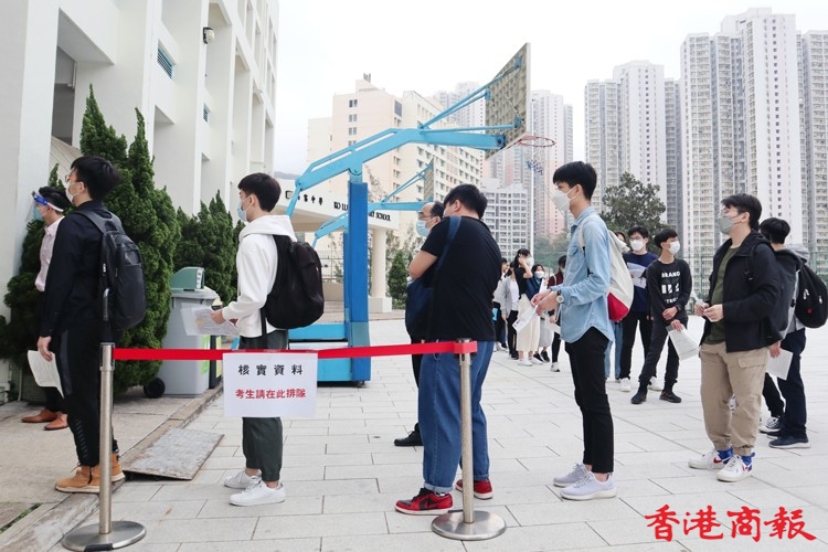 香港中學文憑考試(DSE)今早(22日)開考,八點半考試有考生七點已在考場門外等候。受疫情影響,考生七點四十五分開始進入考場,先要掃描「安心出行」,然後量體溫及資料核實,考場內增設多個檢查站,讓考生入試場前在監考人員前暫除口罩核實身份,兩者有透明屏障分隔,考生除出示准考證、身份證外,還要提交健康申報表,證明快速檢測為陰性,有考生沒能出示而要即場做快速檢測,顯示陰性才能進入考場,今早秩序大致良好。(記者 馮瀚文攝)