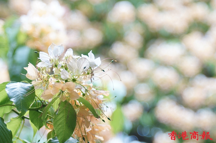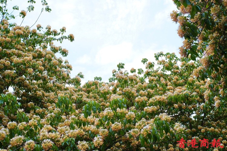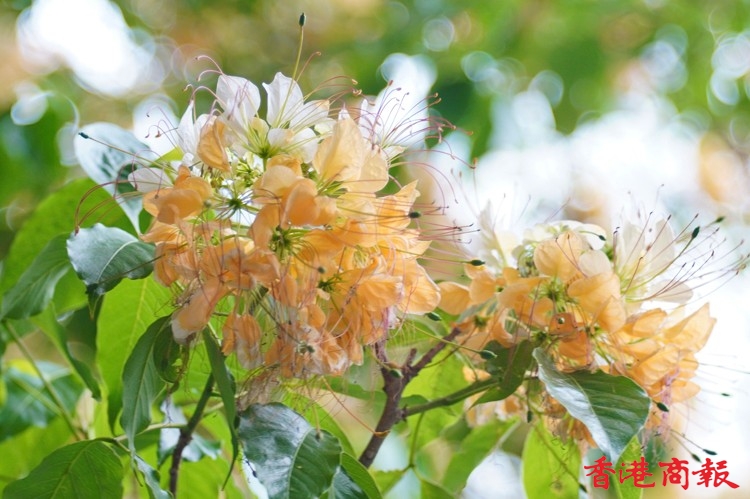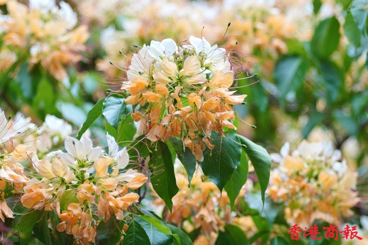 從前被稱為「魚木」的樹頭菜,是生長在熱帶亞洲地區的落葉喬木,後來被引進到香港種植。由於樹頭菜的花有很多細長的暗紅色雄蕊突出花外,使人聯想起蜘蛛的長腳,所以又名「蜘蛛樹」。樹頭菜花由於生長密度很高,黃白色的花團長滿整棵大樹,遠看是一片黃白色的花海,甚為壯觀。(冯俊文攝)