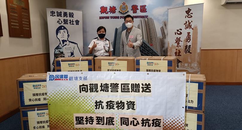 民建聯觀塘支部主席柯創盛聯同副主席潘進源、社幹曾榮輝及支委郭興城將一批面罩及保護衣等抗疫物資送到觀塘警區,慰問前線警員並感謝警隊維持社會穩定。