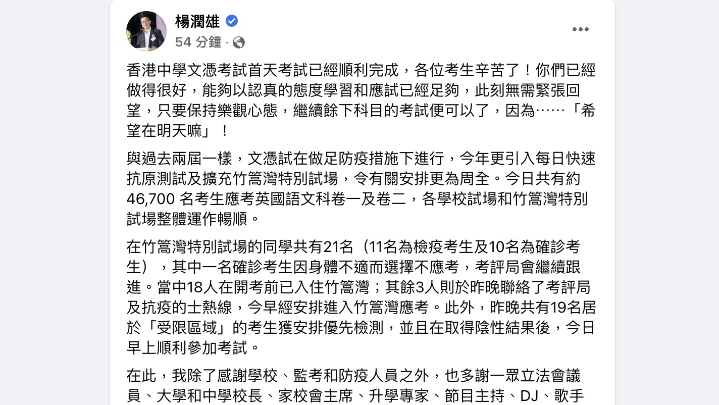 教育局局長楊潤雄在社交平台發文,指中學文憑試首天考試已經順利完成,各位考生辛苦了!學校試場和竹篙灣特別試場整體運作暢順,形容各為考生已經做得很好,能夠以認真的態度學習和應試已經足夠,無需緊張回望,呼籲他們保持樂觀心態,繼續餘下科目的考試。