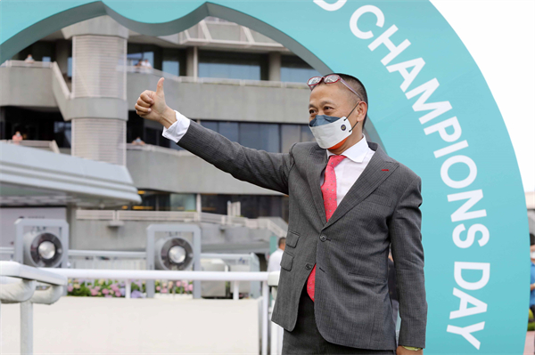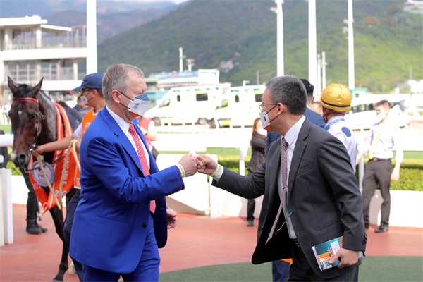 呂健威與馬會行政裁應家柏在凱旋門處擊拳慶祝。