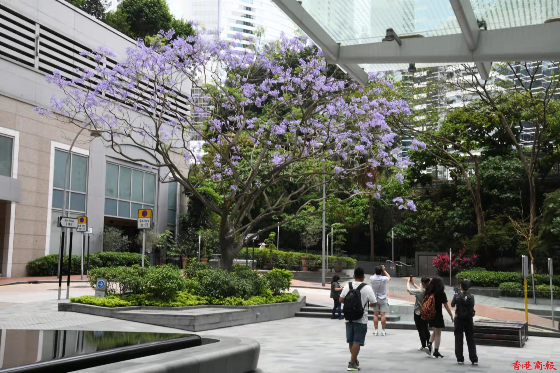 灣仔除了店舖林立,也是賞藍花楹的人氣地點。灣仔的一個小斜坡上,有一棵藍花楹,其枝節夠廣,開花時淡紫的花朵開得十分茂盛,與後面的大廈景色形成強烈對比,吸引不少人來賞花拍照。由於今年天氣較熱,藍花楹於三月底已經開花,而盛放期會在四月及五月。(蔡啟文攝)