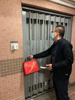 香港疫情一日未減退,防疫工作不能鬆懈,李惠明帶領會員全力協助政府派發「防疫服務包」,派發近900個防疫包往大白田東幾座三無大廈,當中不乏無電梯唐樓、天台屋及劏房戶,大家無懼疫情,背負著紅白藍抗疫福袋,將防疫包走路運送上7層天台,逐戶拍門派送,汗水雖浸濕衣裳,但同心抗疫,關愛有我卻在心中迴響。