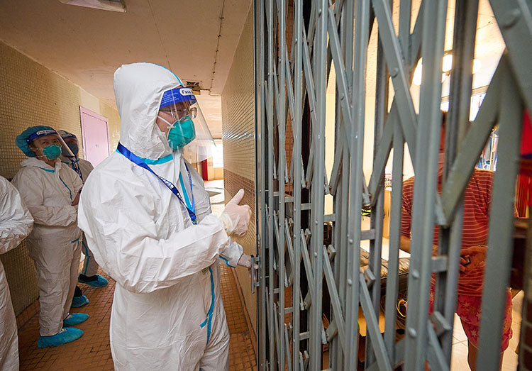 創新及科技局局長薛永恒昨日(30日)聯同140多名人員一同參與鴨脷洲利東邨東安樓的「圍封強檢」行動,逐家逐戶拍門並安排居民接受檢測。