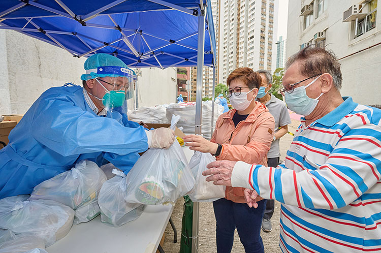 薛永恒昨日(30日)在「圍封強檢」行動中,向居民派發食物包及由中央人民政府捐贈的抗疫中成藥。