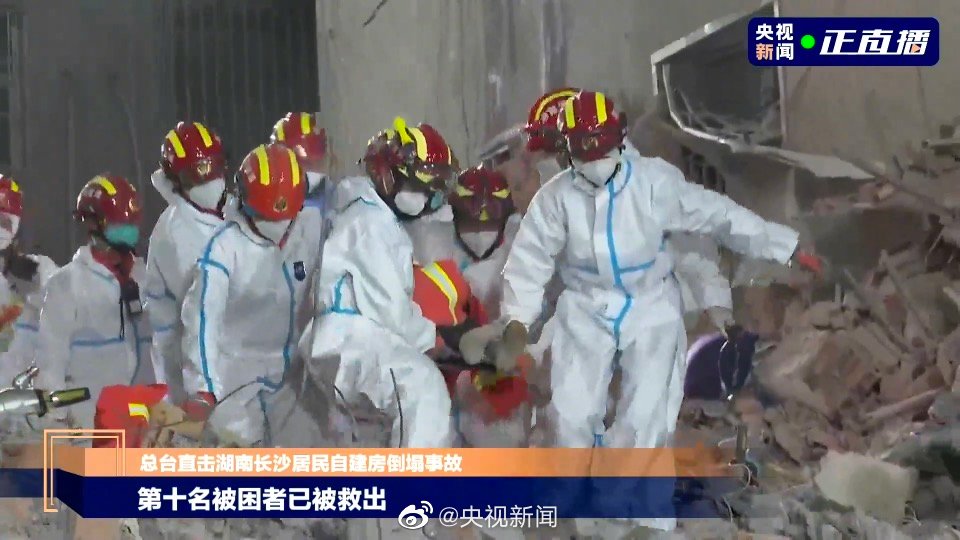 4月29日12時24分,湖南長沙望城區一居民自建房發生倒塌事故,造成23人被困,另有39人失聯。據央視新聞最新消息,總台記者從湖南長沙居民自建房倒塌事故救援現場獲悉,4日晚9時許在事故現場再發現一名幸存者。5日凌晨,在被埋壓131個小時後,第10名被困人員獲救。據悉,這名被困人員是一名女性,是救援力量對建築廢墟逐層剝離的過程中發現的,目前已緊急送往醫院救治。
