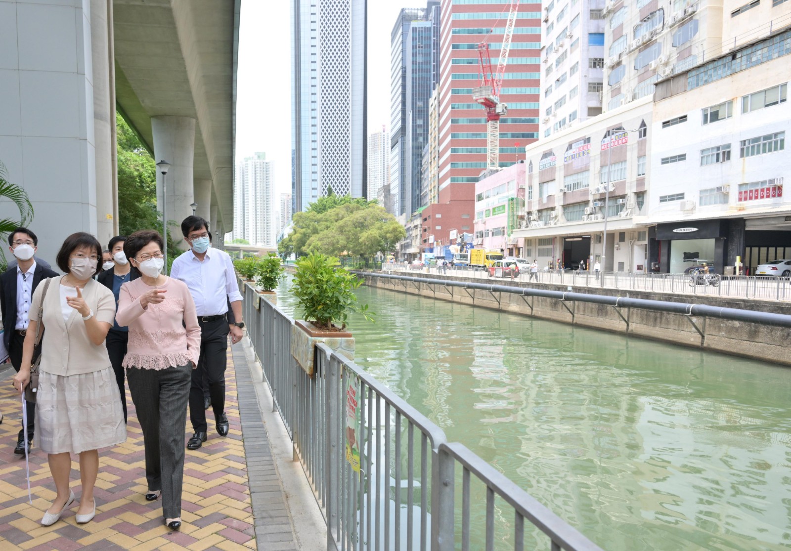 林鄭其後參觀涌尾明渠及毗鄰公共空間,聽取區潔英介紹明渠活化項目和兩項「地方營造」項目計劃,即重塑大王爺廟毗鄰公共空間,包括重鋪地面和提供長椅及壁畫,以成為居民日常休憩和社交聚腳點,以及建設「黃竹坑綠色連線」,通過具吸引力的休憩處和便捷的行人設施,連接港鐵黃竹坑站和香港仔郊野公園。她欣悉有關項目將為市區注入新活力,亦善用並突顯本港繁華鬧市與恬靜郊野僅咫尺之遙的獨特風貌。