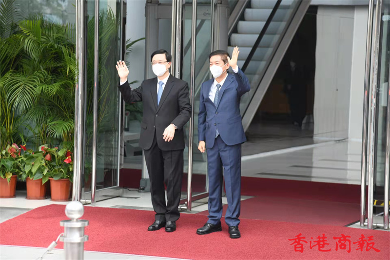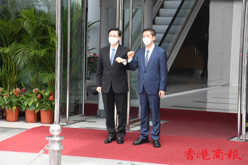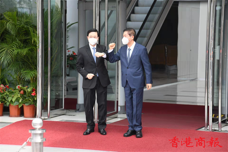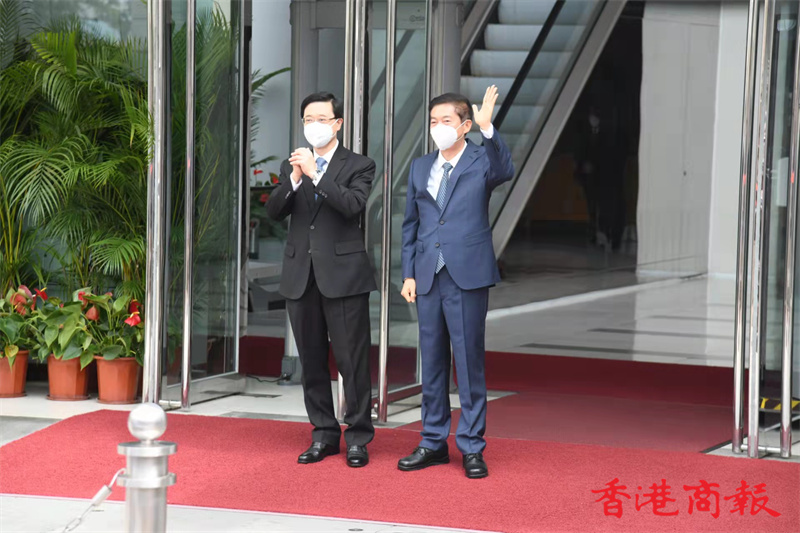 第六任行政長官當選人李家超今日(9日)下午禮節性拜訪4個中央駐港機構,包括中聯辦、駐港國安公署、外交部駐港特派員公署以及駐港部隊。下午約3時許,李家超到訪中聯辦,中聯辦主任駱惠寧在中聯辦大門迎接,並向在場媒體揮手致意。