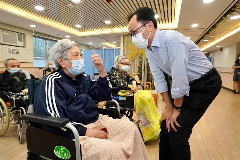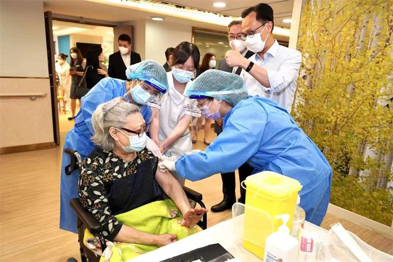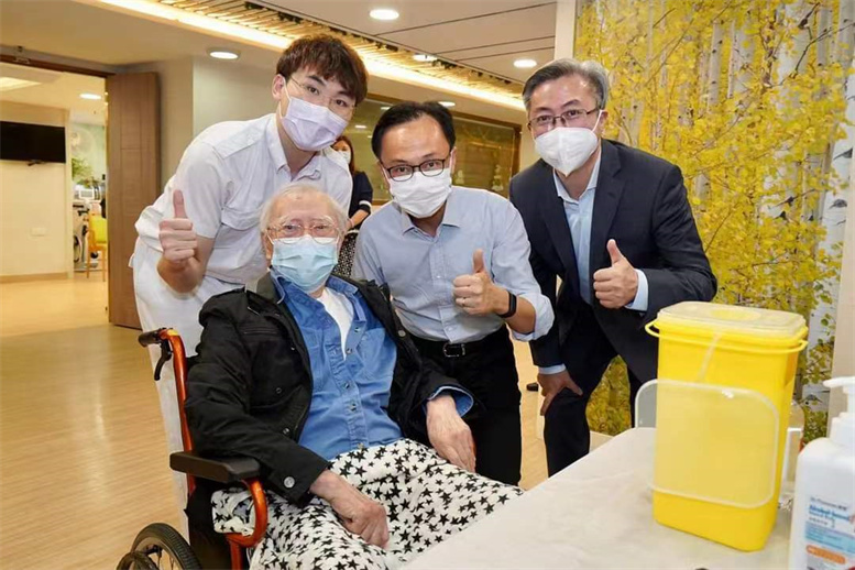 頂圖:5月11日,公務員事務局局長聶德權到黃大仙一間護養院為接種新冠疫苗的院友打氣。