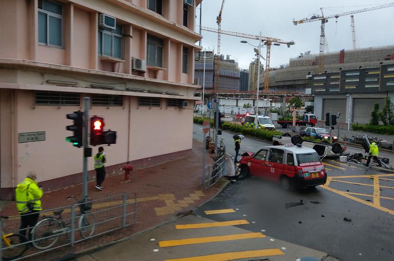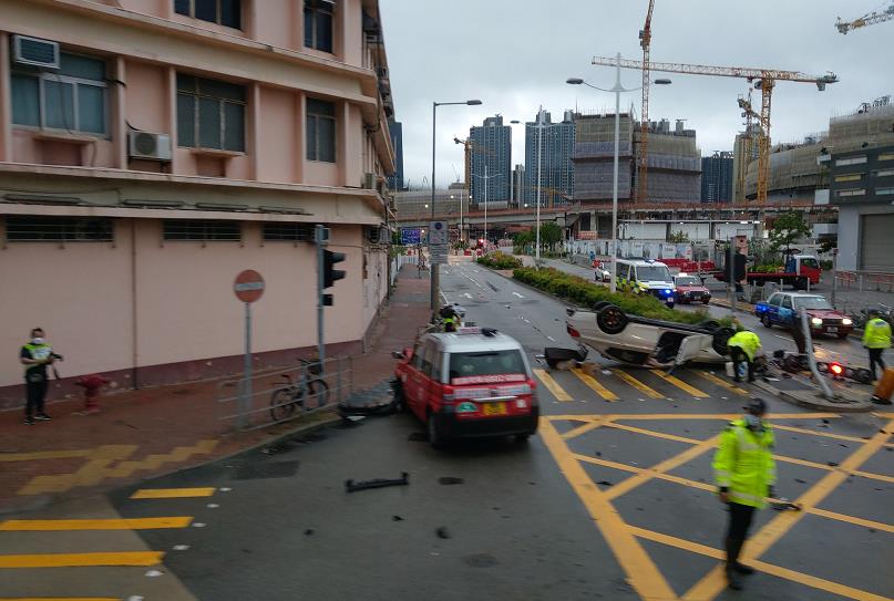 今日(15日)凌晨5許,一輛私家車沿土瓜灣道往觀塘方向行駛,當行駛至木廠街交界時,一輛的士由木廠街高速駛至,私家車司機閃避不及,被撞後全車翻側繼而四輪朝天,掃毀路中一支交通燈,車上司機和2名男乘客負傷自行爬出車外,坐在路旁報警求救,的士司機和一名男乘客亦受傷。